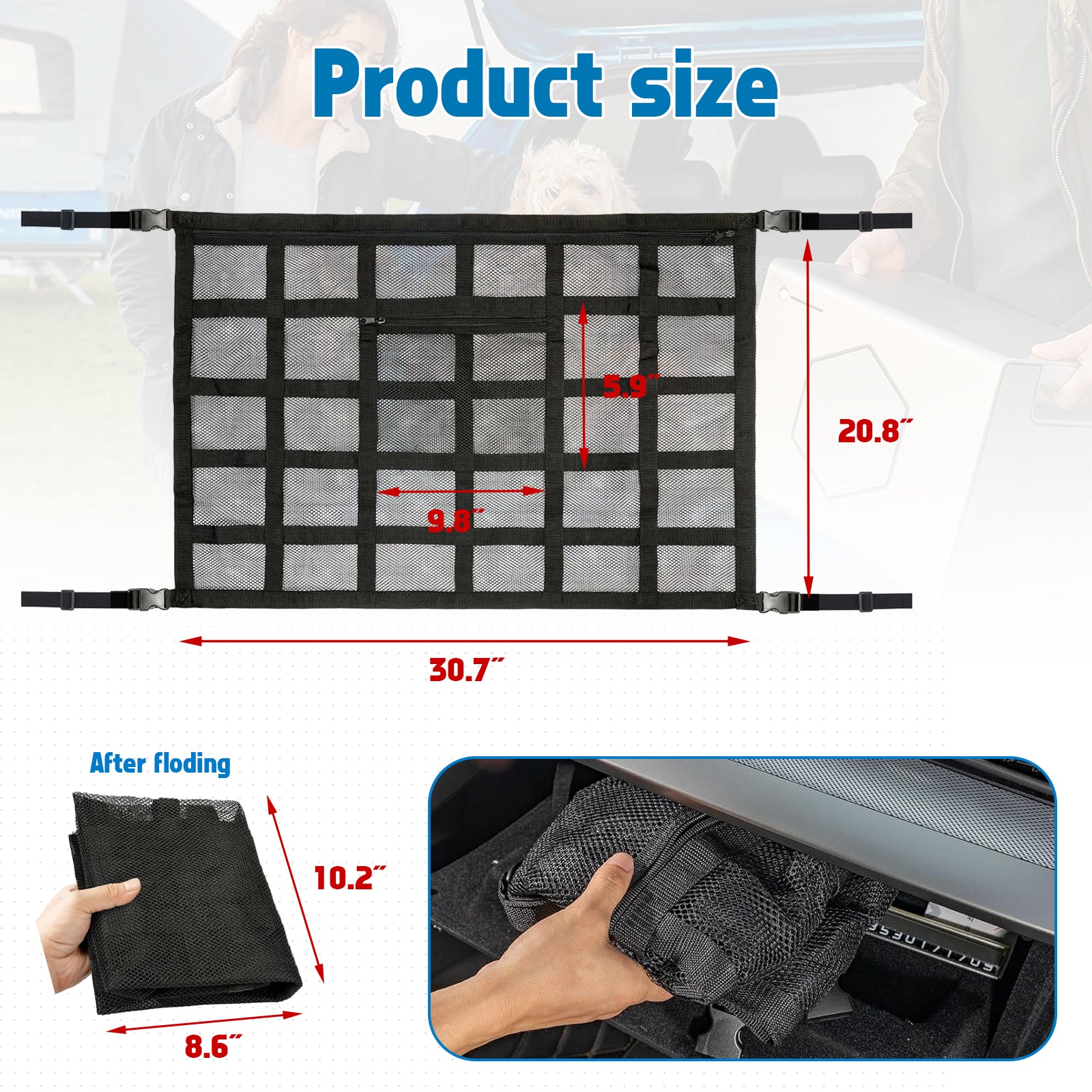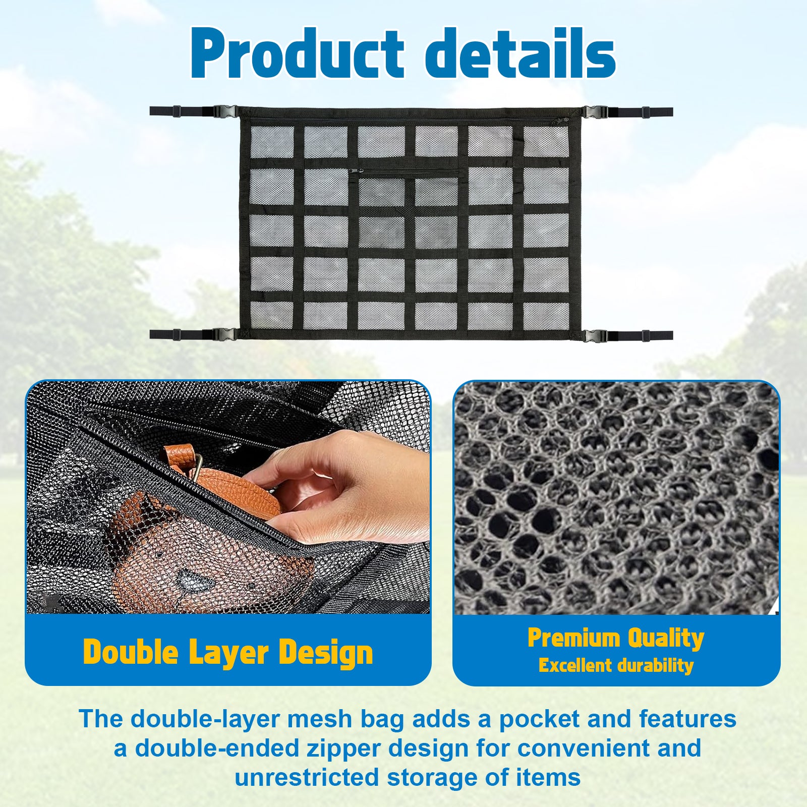 Premium Quality: The car ceiling cargo net is made of double-layer polyester material, which boasts excellent durability, has 9 fixed reinforcement straps, the strict stitching and sealing process makes the edges stable enough.