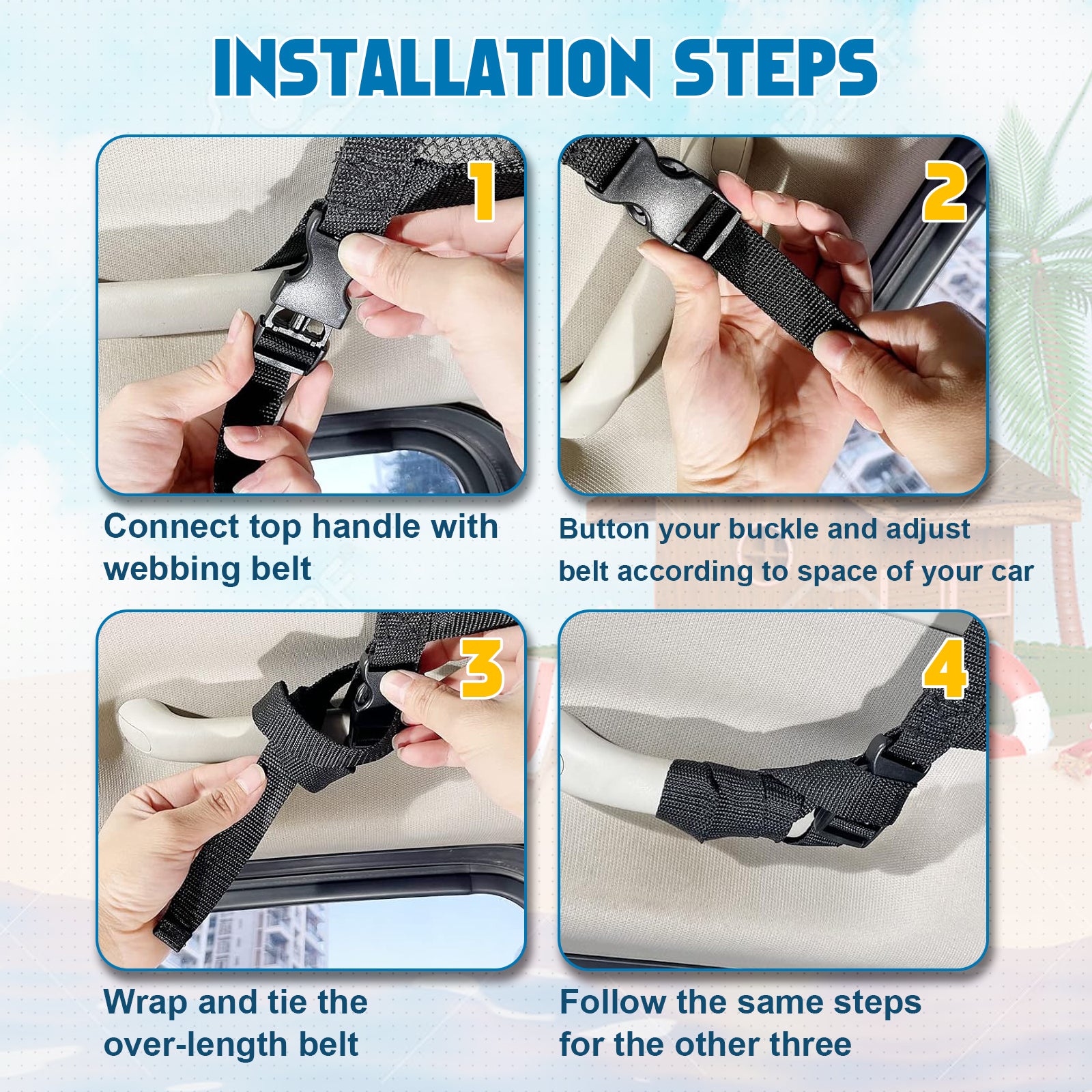 Easy Installation: The car ceiling storage device is extremely easy to install. The installation steps are as follows: 1. Connect the top handle with the webbing. 2. Fasten the buckle and adjust the seat belt according to your car space. 3. Wrap and tighten the extra-long waist belt.