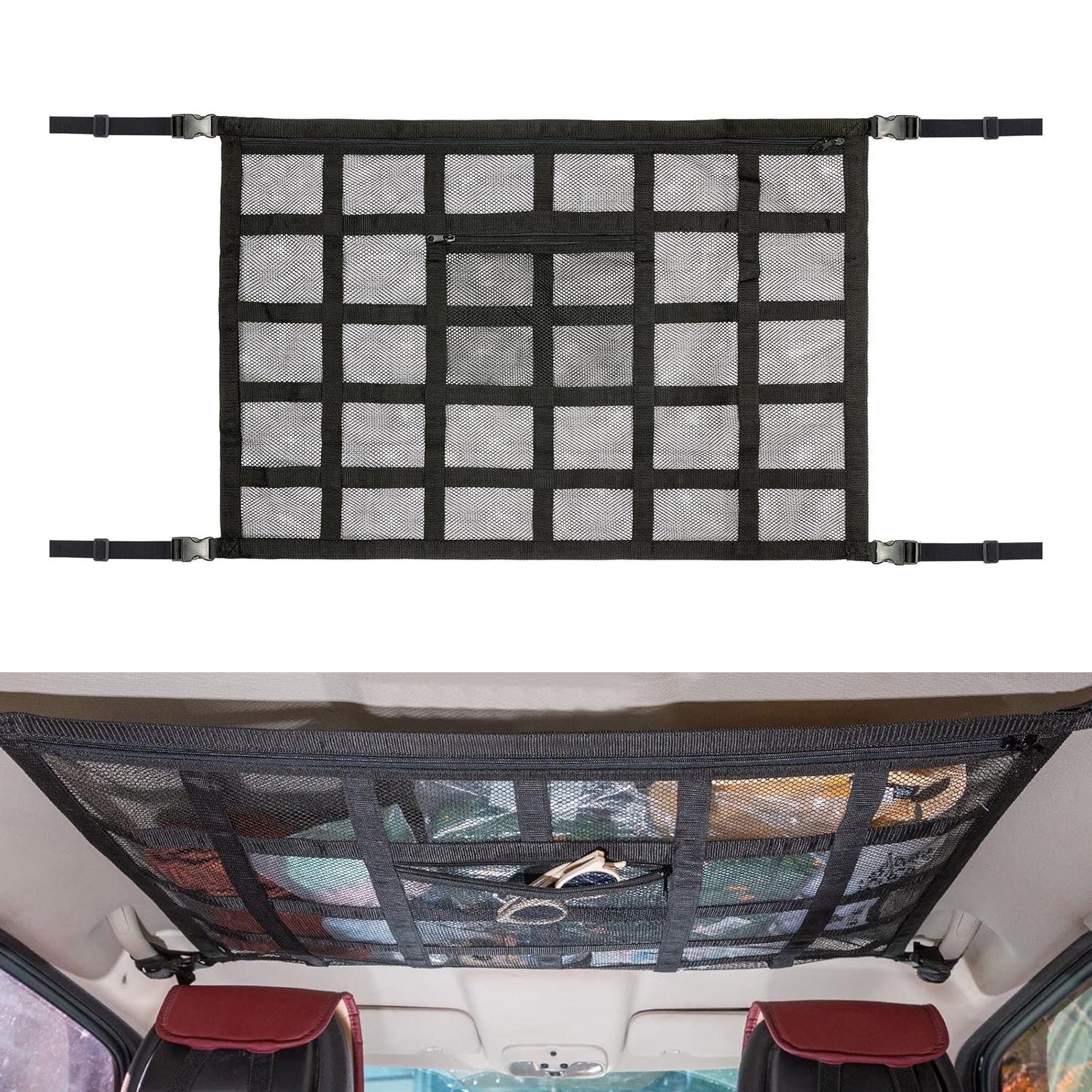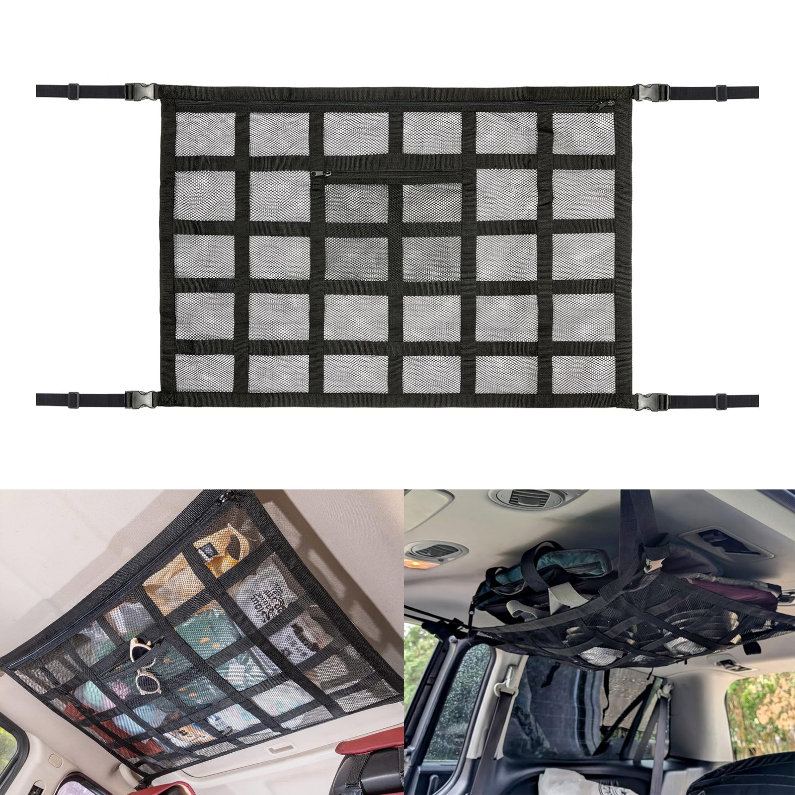 Large Capacity: The double-layer mesh bag adds a pocket and features a double-ended zipper design for convenient and unrestricted storage of items. You can store a lot of things such as children's quilts, toys and clothes, but also small items such as coins, bank cards, keys, small wallets, etc. This ceiling cargo net serves as an essential car storage compartment for in-car living