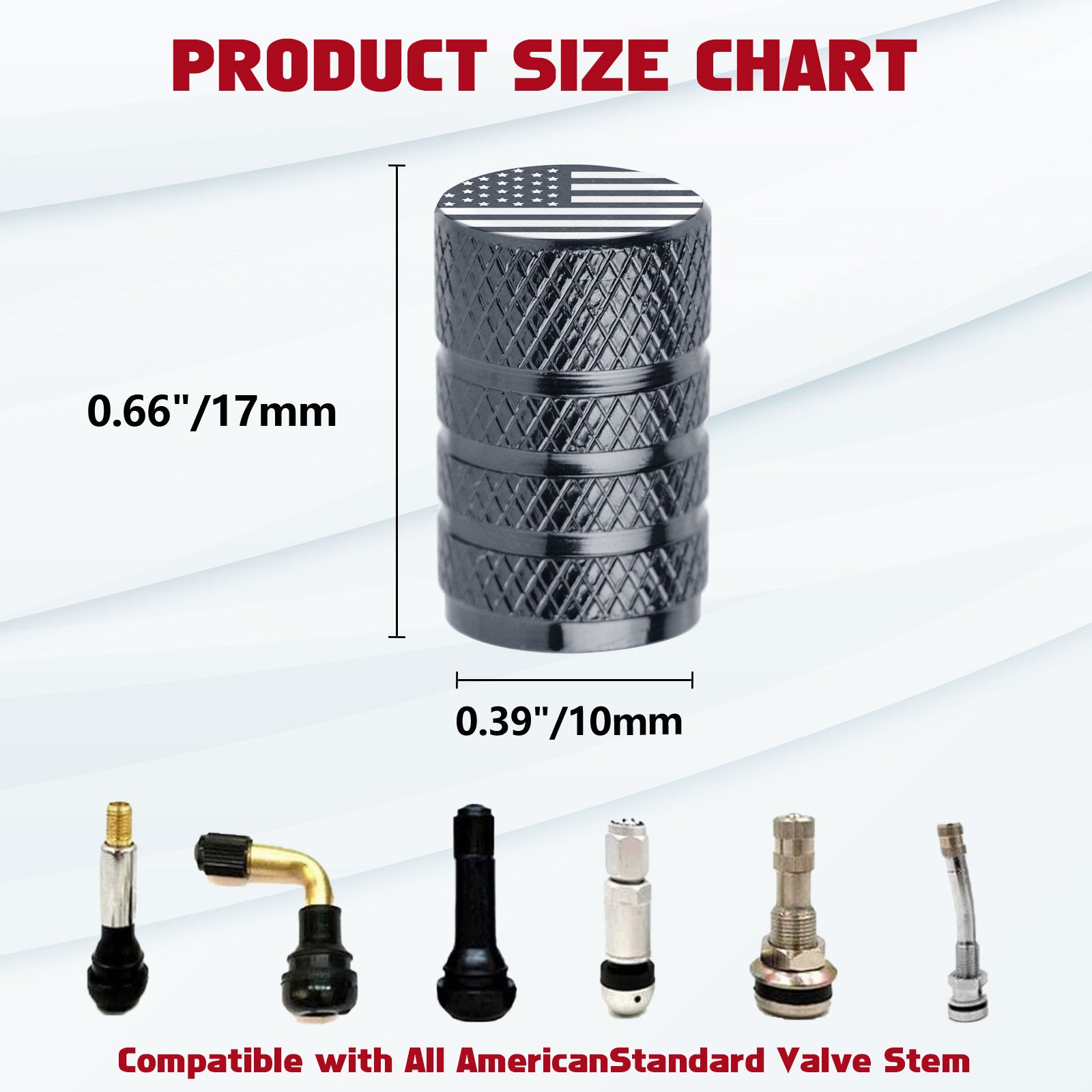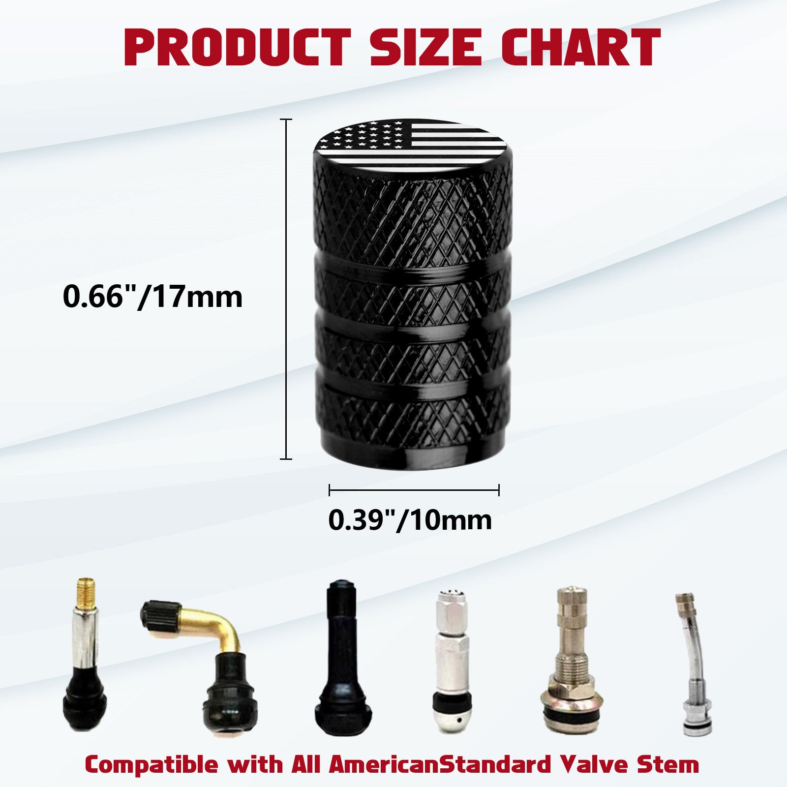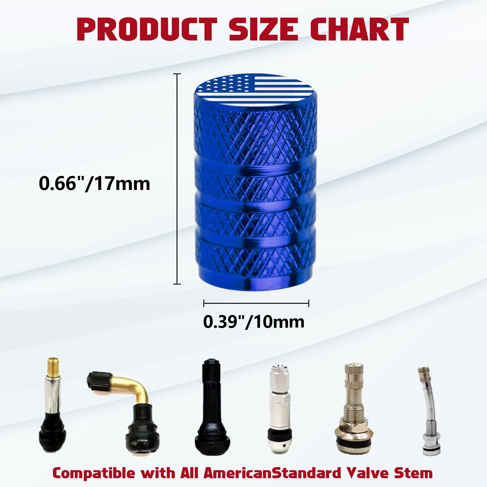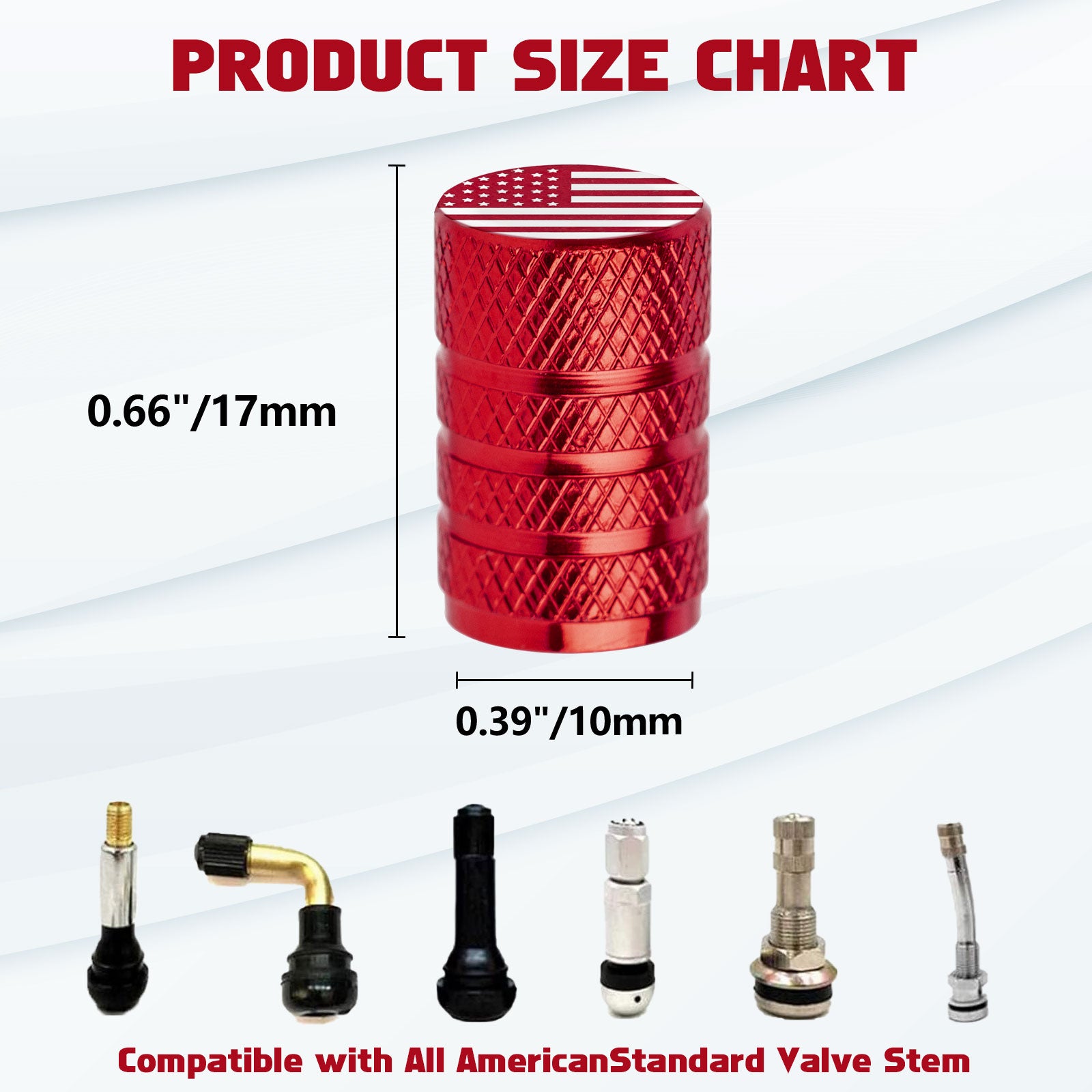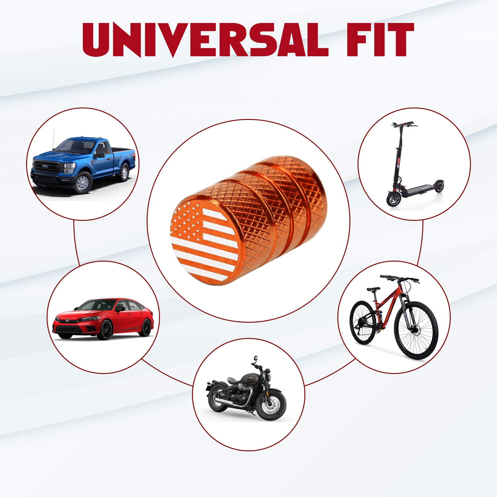 This listing is for 1 set (4pcs) of Anodized Aluminum Alloy American Flag Tire Valve Stem Caps universal for Cars, Trucks, Motorcycles and Bicycles.