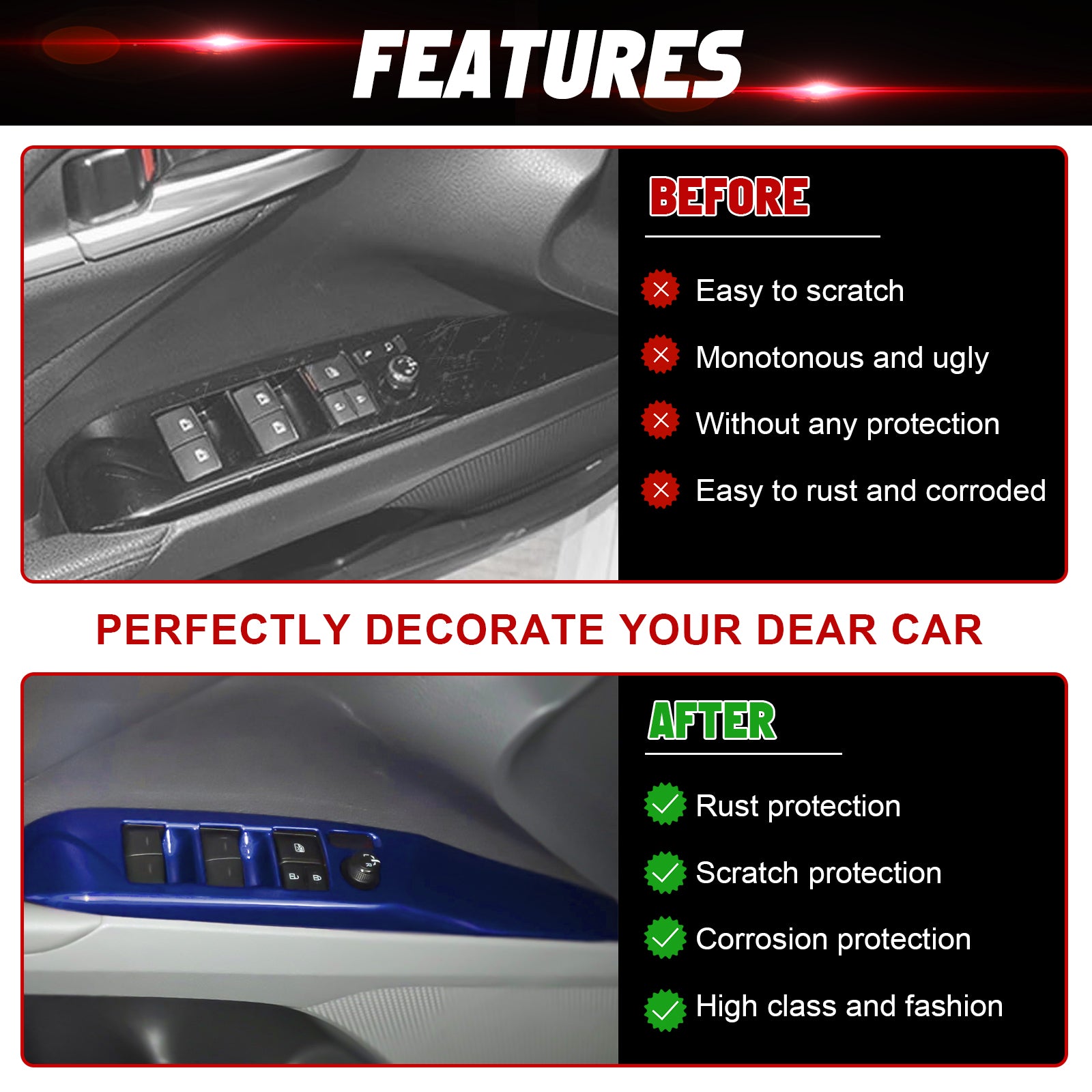 [Seamless Fit] Customized according to the original car size, it can prevent installed area from scratches and won't scrape the paint off or damage the original equipment.