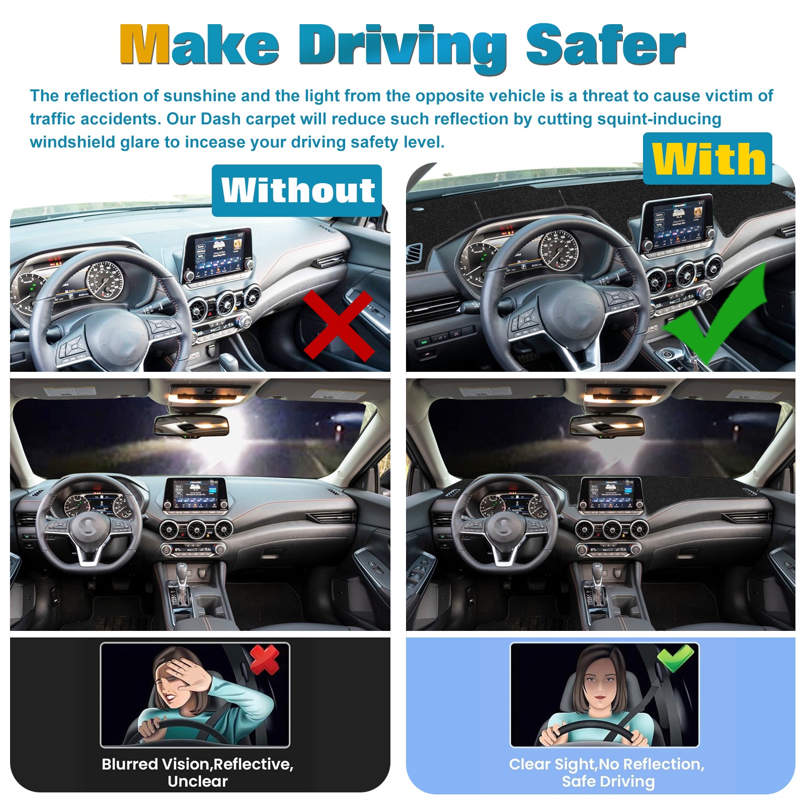 • The reflection of sunshine and the light from the opposite vehicle is a threat to cause victim of traffic accidents. Dash covers are a great way to reduce windshield glare. Our Dash carpet will reduce such reflection by cutting squint-inducing windshield glare to increase your driving safety level.