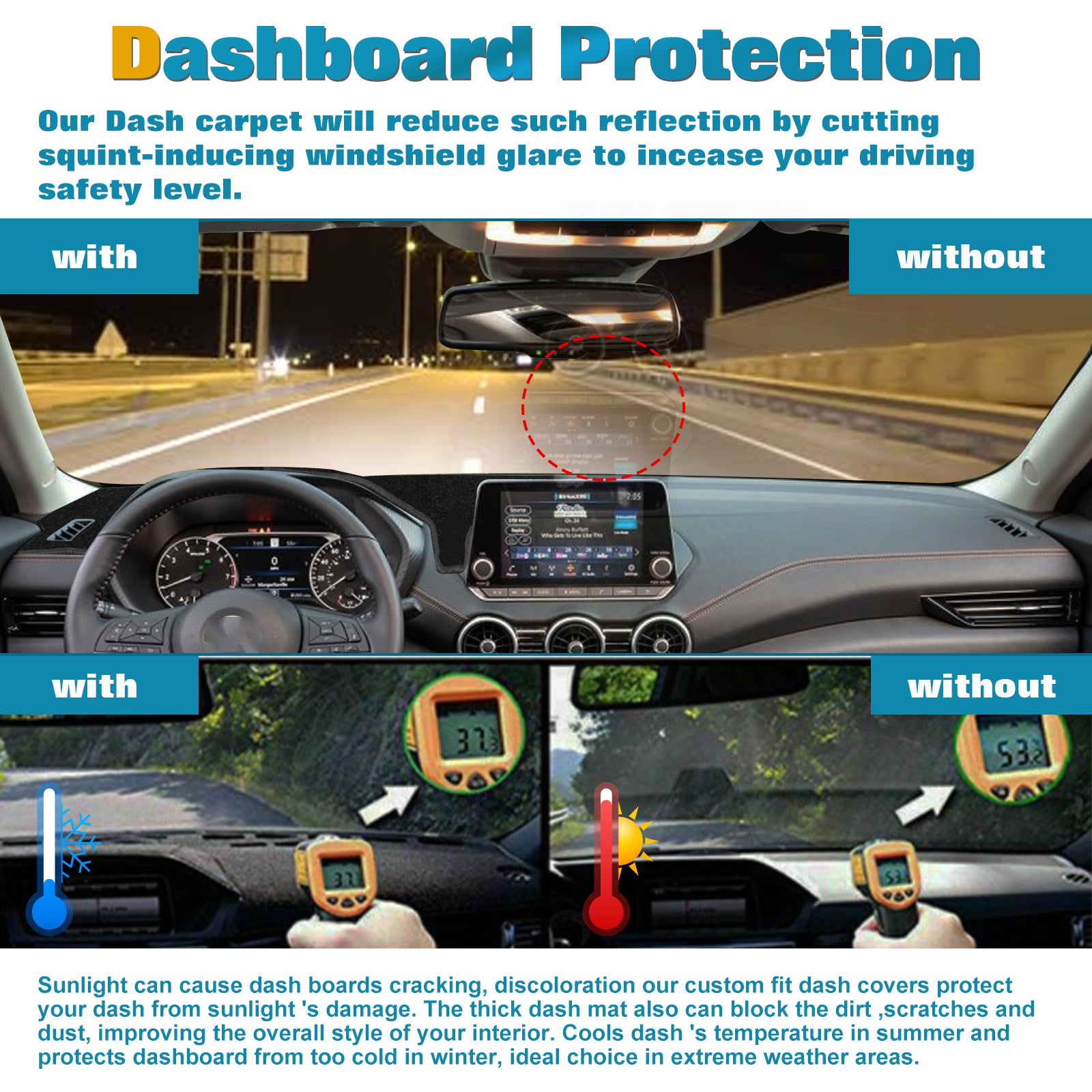 • This dash cover protects the dash surface from ultraviolet rays that can cause dash boards cracking discoloration and warping. The thick dash mat also can block the dirt ,scratches and dust or cover blemishes and imperfections of old dashboards, improving the overall style of your interior. Cools dash 's temperature in summer and keep warmer in winter, ideal choice in extreme weather areas.