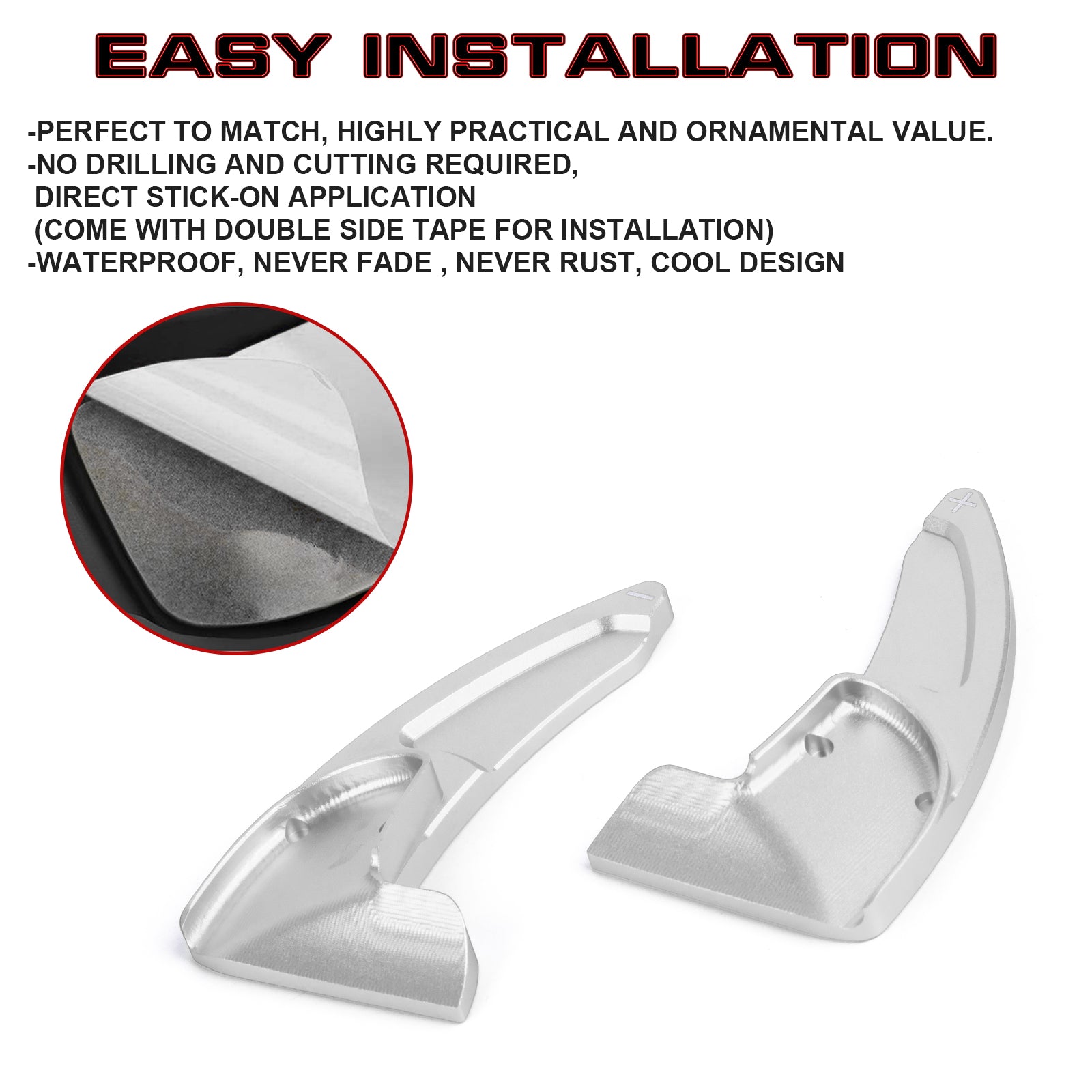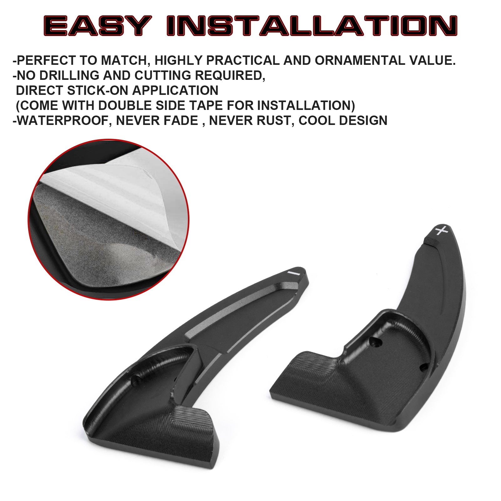 Installation: No drilling or tools required. Just peel and stick with the adhesive tape.Before installation, please clean the both paddles and we highly recommend to use a lighter to heat the adhesive tape to for better adhesion.