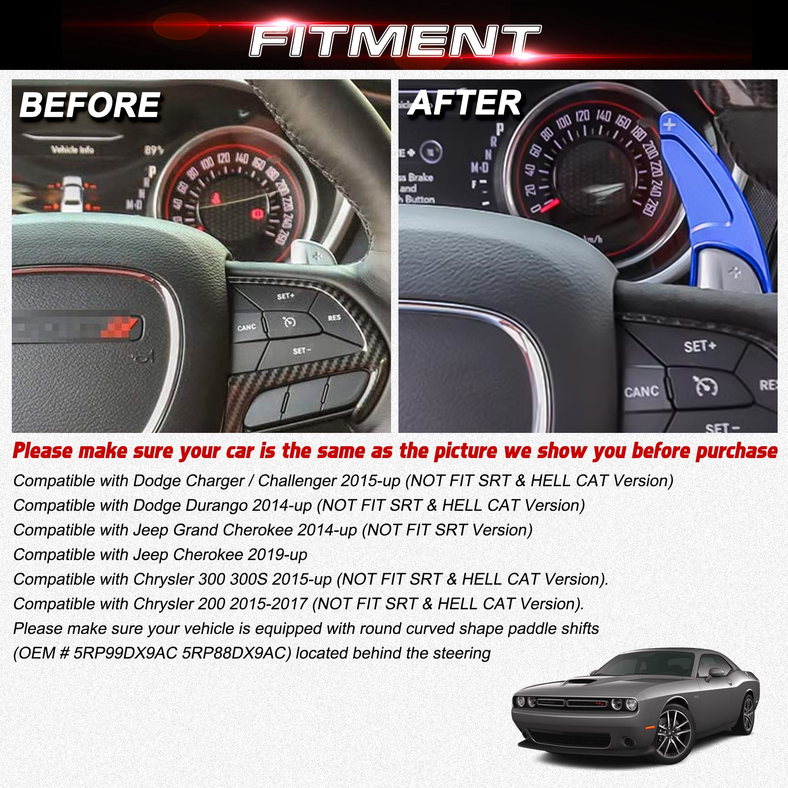 Fitment: Compatible with Dodge Charger Challenger Durango 2015-2021 (NOT FIT SRT & HELL CAT Version) *Compatible with Jeep Grand Cherokee 2014-2021 (NOT FIT SRT Version) *Compatible with Jeep Cherokee 2019-2021 *Compatible with Chrysler 300 300S 2015-2021 & 200 2015-2017 (NOT FIT SRT & HELL CAT Version) with OEM paddle shifters.
