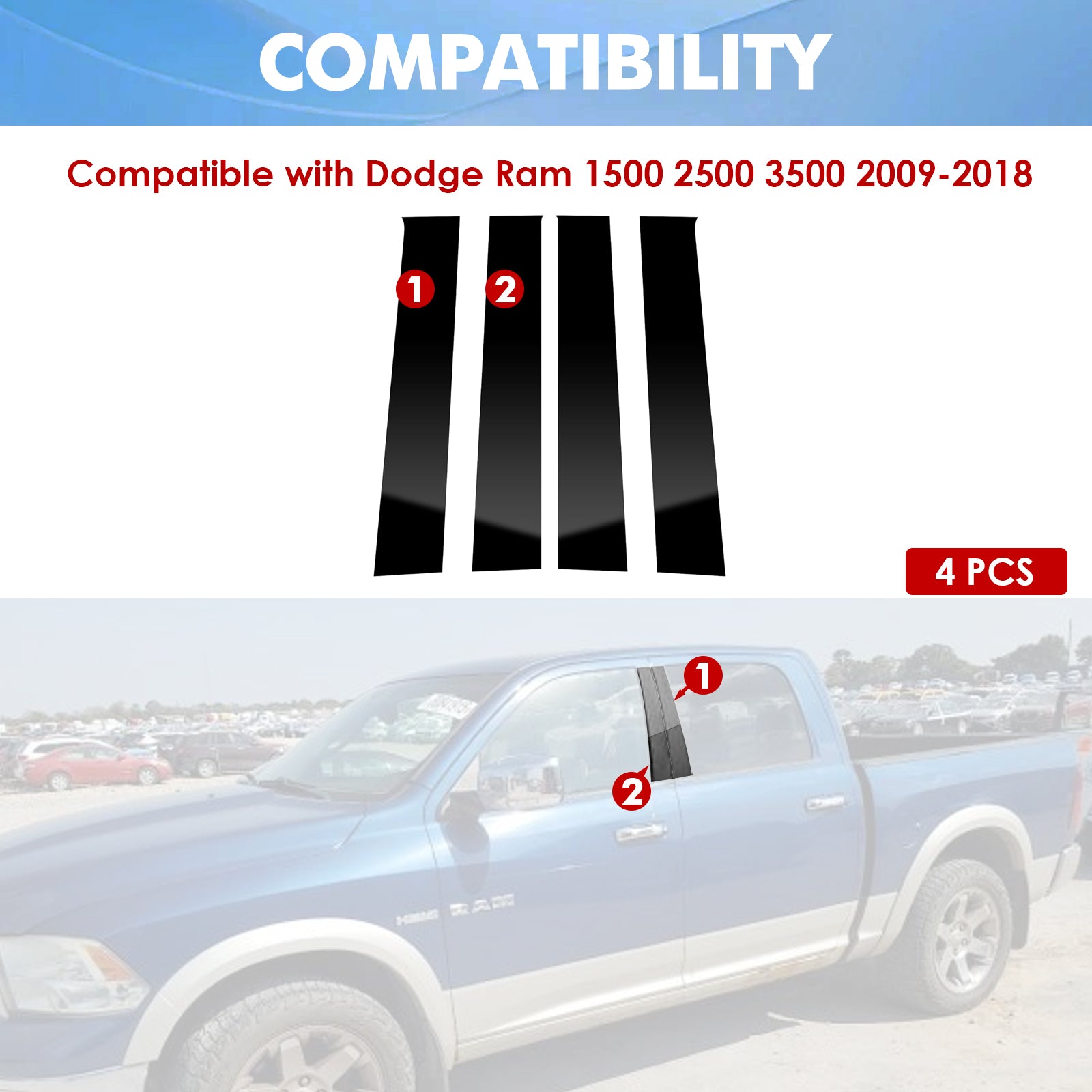 This listing is for one set of Glossy Black pre-cut Door Window Pillar Trim Overlay Stickers, specially compatible with Dodge Ram 1500 2500 3500 2009-2018
