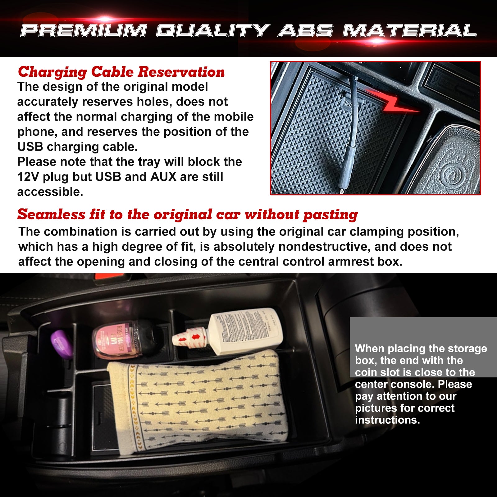 Perfect Design: Help you wipe out the mess on your console box and create a neat and clean environment. Various items can be placed in different areas, keep your center console in a more organized shape so that everything is easier to find when needed. Reserved USB port do not affect charging use.