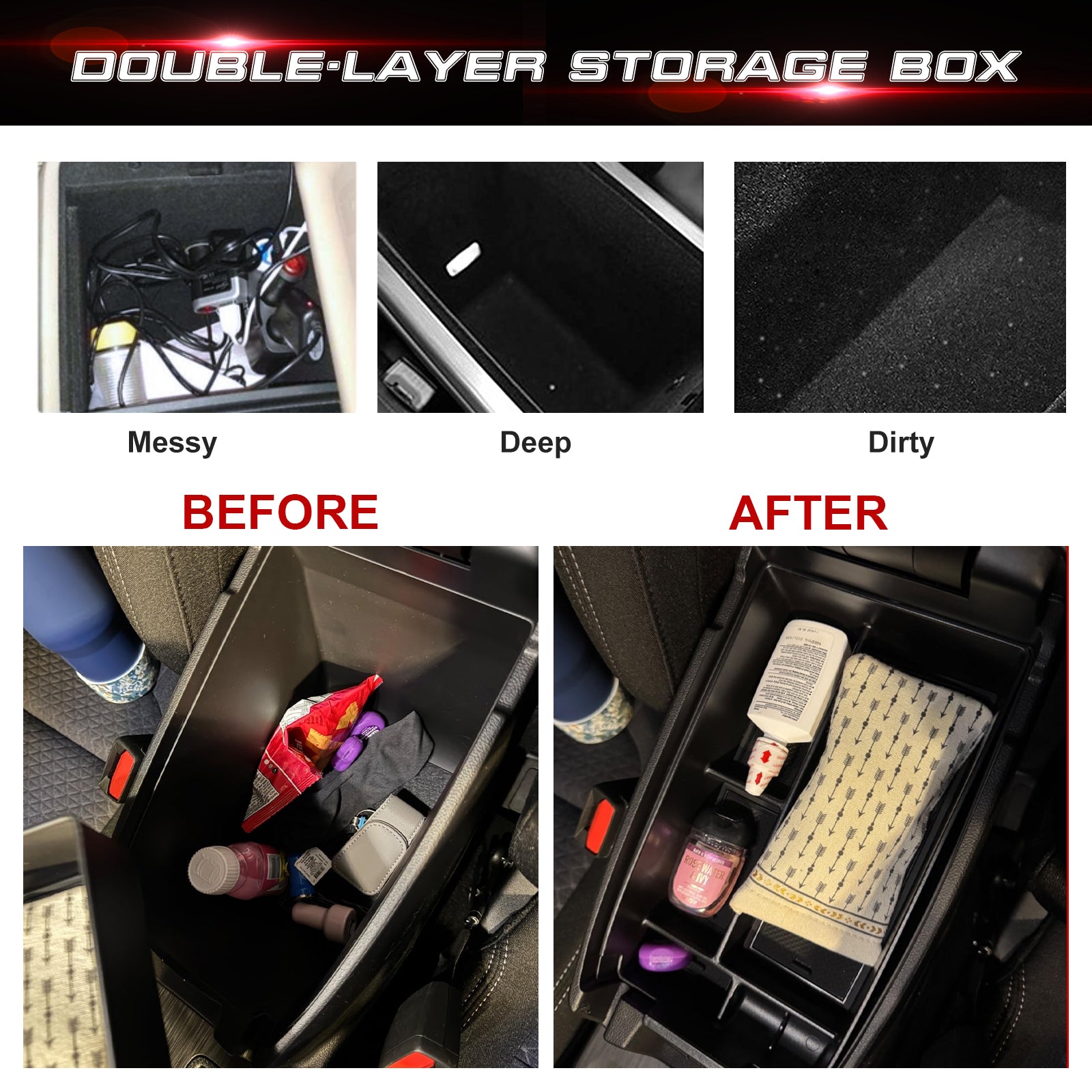 Extra Storage layer: This storage box divides your center console into upper and lower layers, allowing you to put more stuff while hiding valuables and personal belongings from prying eyes . It can keep the small items and frequently used stuff organized and easily accessible.