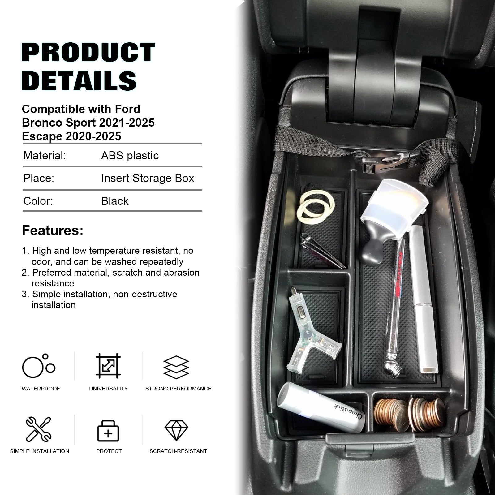 This listing is for 1 set of Center Console Armrest Storage Box Insert Organizer Tray Compatible with Ford Bronco Sport 2021-2025, Escape 2020-2025