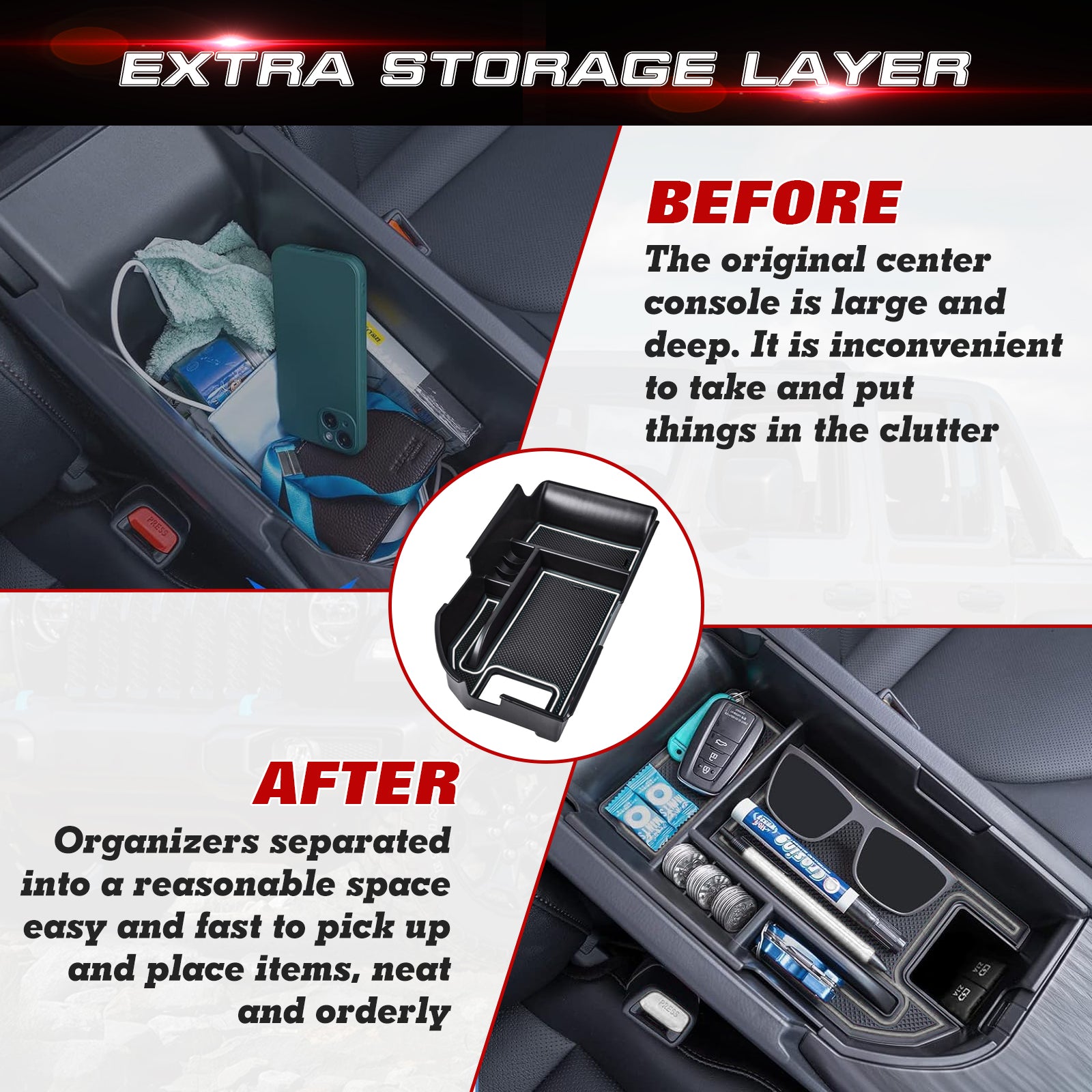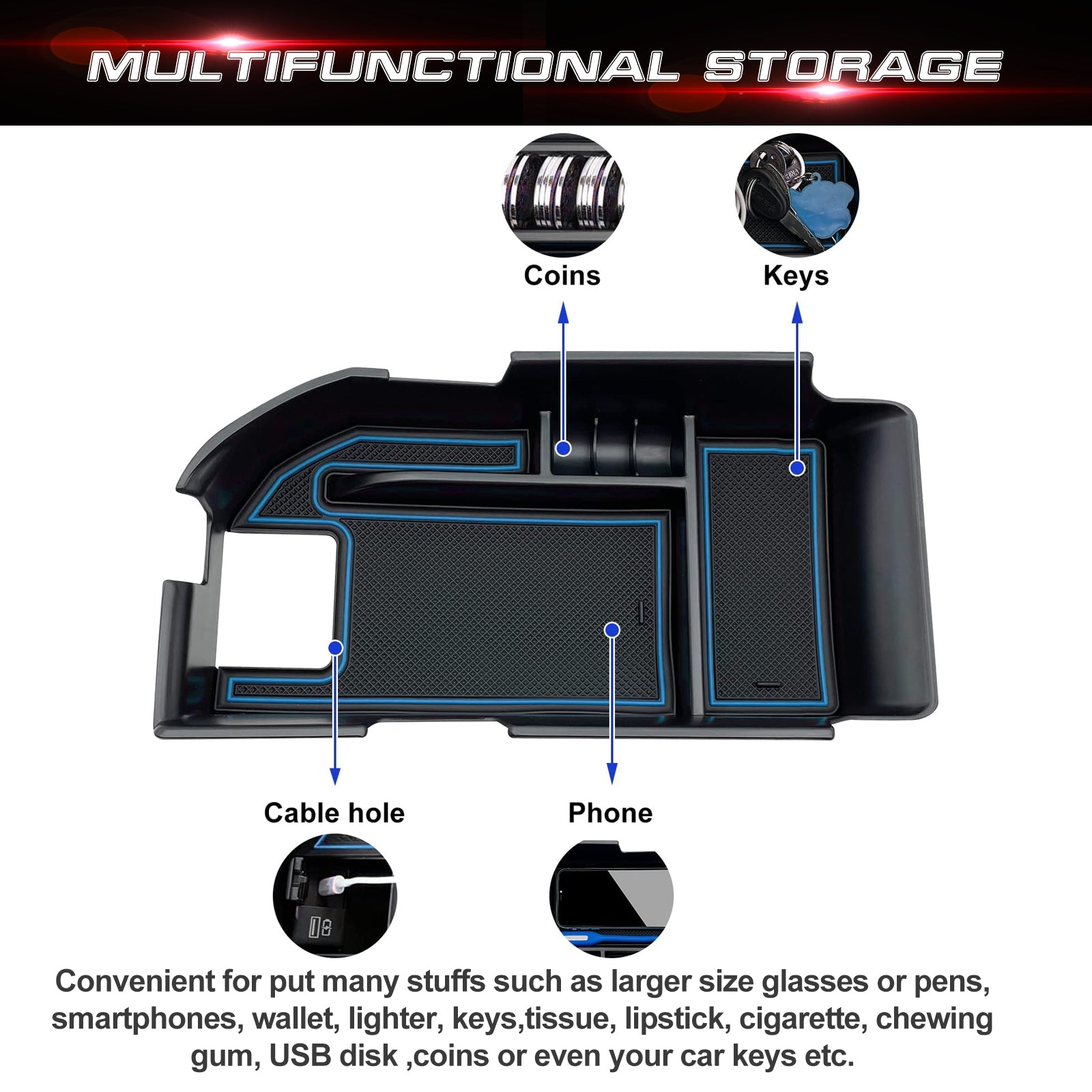 Extra Storage layer: This storage box divides your center console into upper and lower layers, allowing you to put more stuff while hiding valuables and personal belongings from prying eyes . It can keep the small items and frequently used stuff organized and easily accessible.
