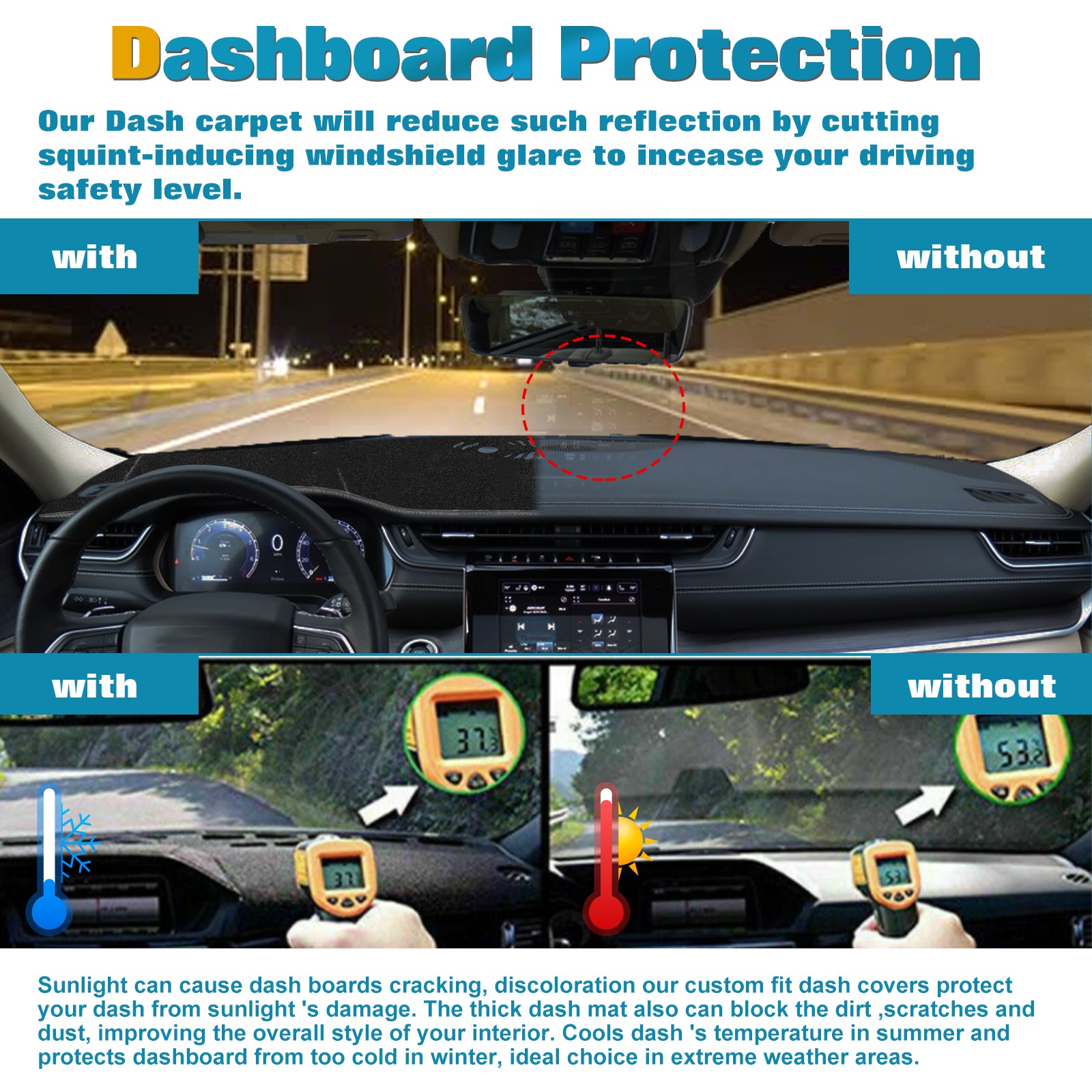 - This dash cover protects the dash surface from ultraviolet rays that can cause dash boards cracking discoloration and warping. The thick dash mat also can block the dirt ,scratches and dust or cover blemishes and imperfections of old dashboards, improving the overall style of your interior. Cools dash 's temperature in summer and keep warmer in winter, ideal choice in extreme weather areas.