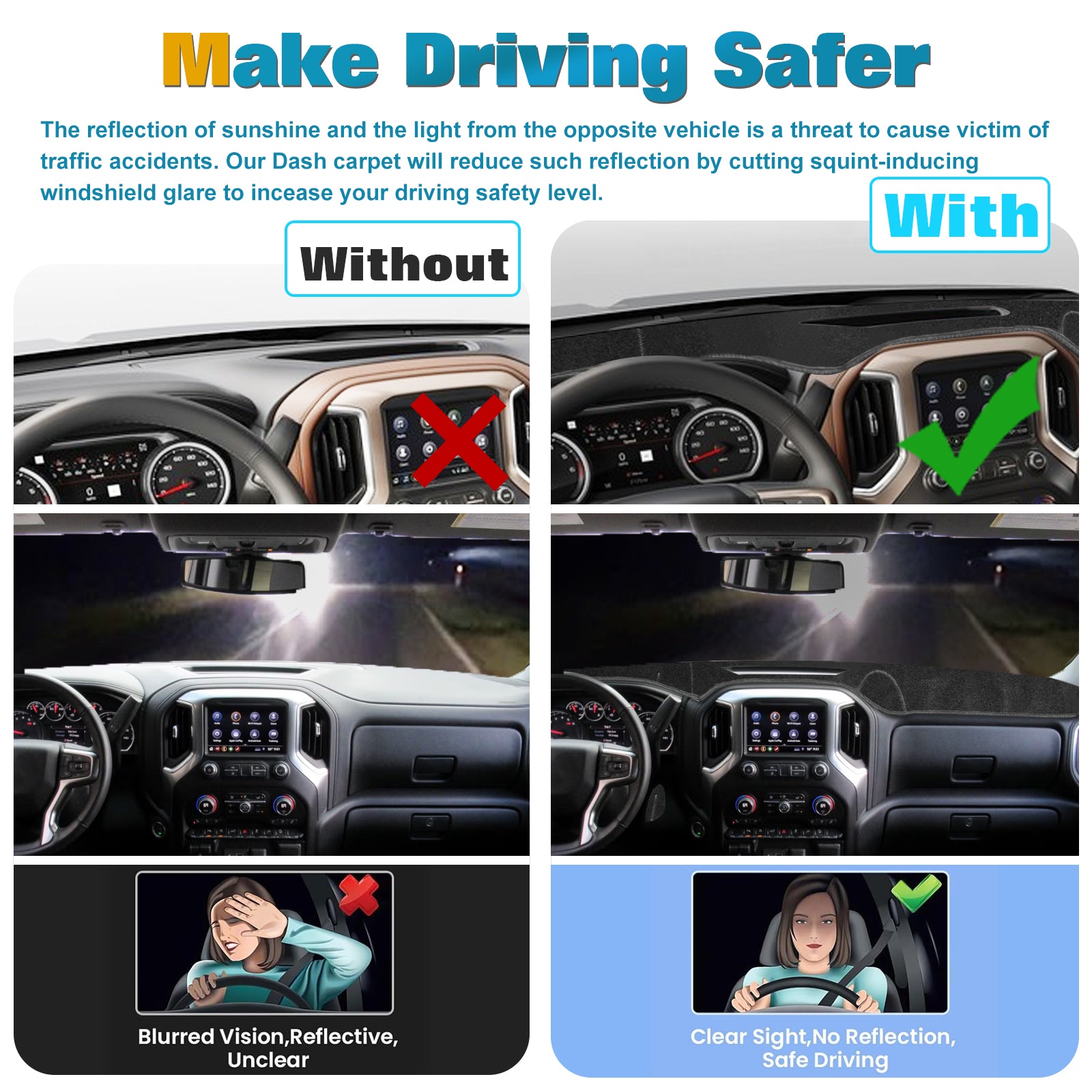 - The reflection of sunshine and the light from the opposite vehicle is a threat to cause victim of traffic accidents. Dash covers are a great way to reduce windshield glare. Our Dash carpet will reduce such reflection by cutting squint-inducing windshield glare to incease your driving safety level.