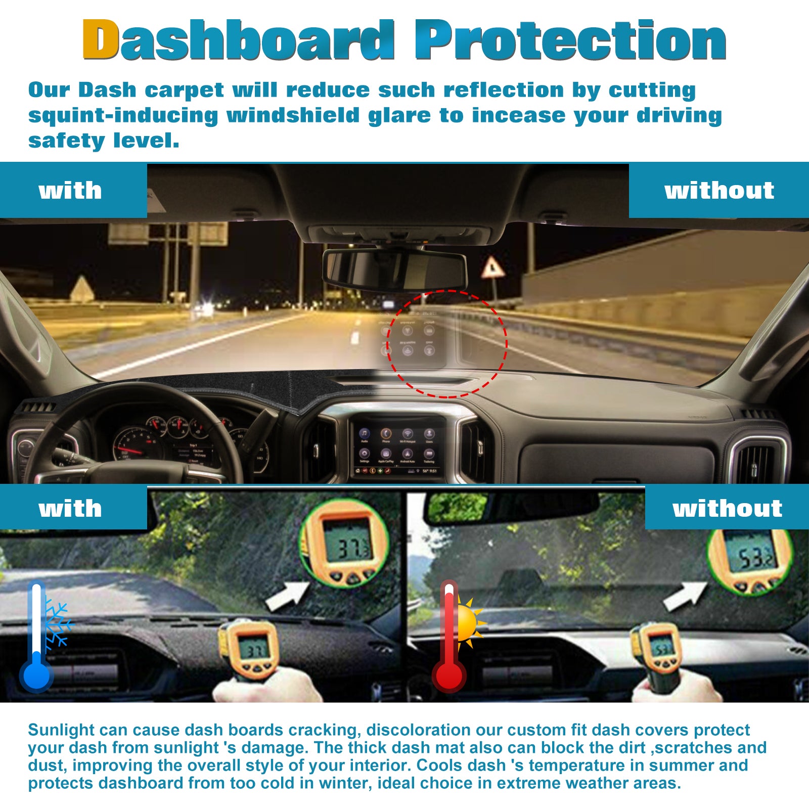 - This dash cover protects the dash surface from ultraviolet rays that can cause dash boards cracking discoloration and warping. The thick dash mat also can block the dirt ,scratches and dust or cover blemishes and imperfections of old dashboards, improving the overall style of your interior. Cools dash 's temperature in summer and keep warmer in winter, ideal choice in extreme weather areas.