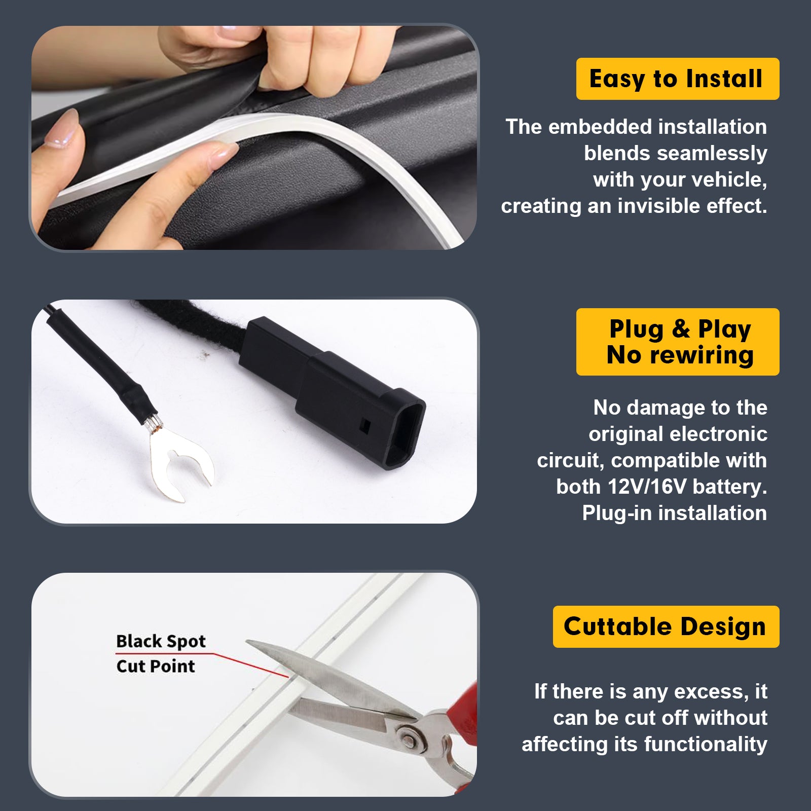 - 【Applicable Models】Compatible with Tesla Model 3 (2021–2023) and Model Y (2021–2023). If the LED trunk light strip is too long, you can trim it at the black spots to fit your car. Note: After cutting, be sure to properly seal the ends of the light strip.