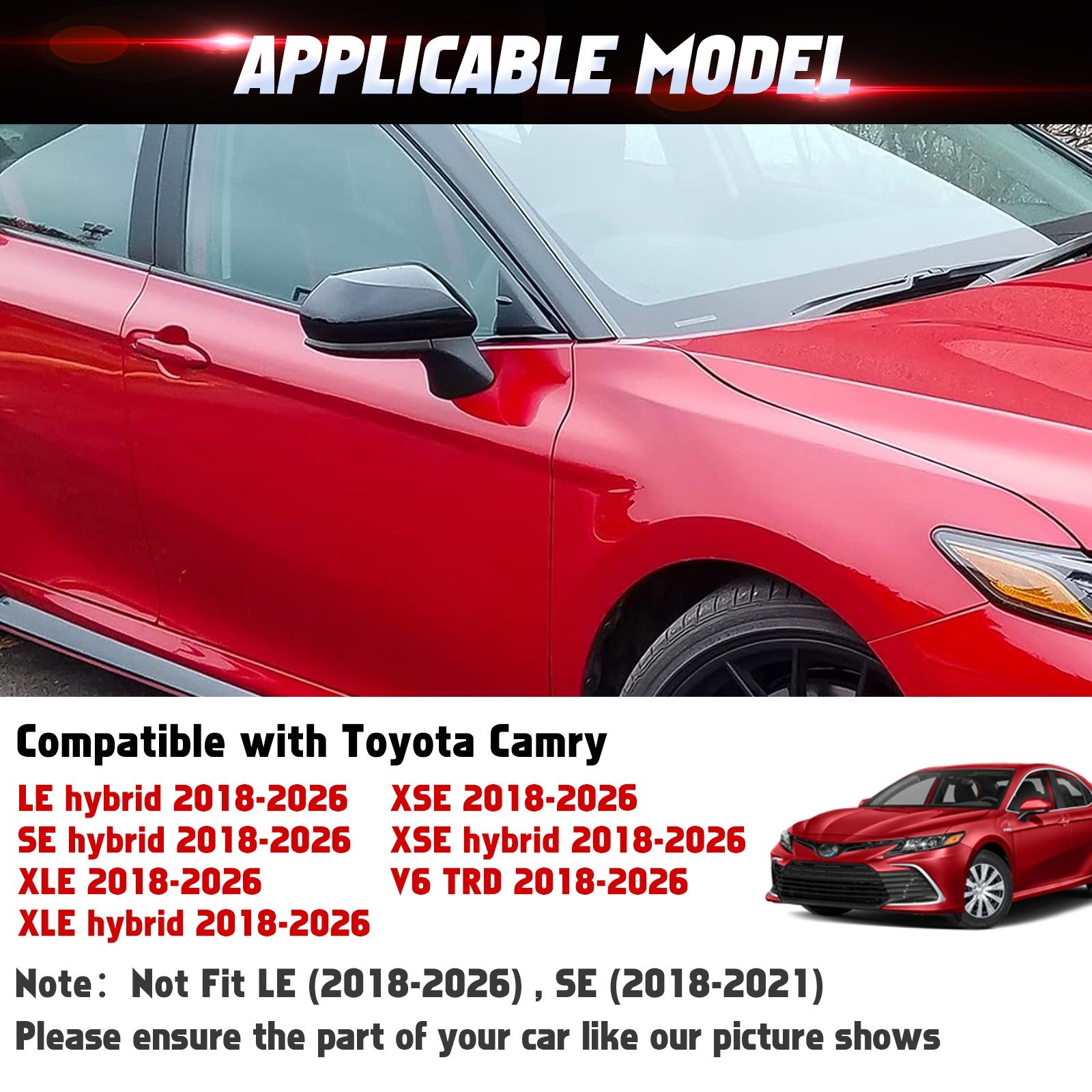- Note: Not Fit Camry LE (2018-2026). Not Fit Camry SE (2018-2021)