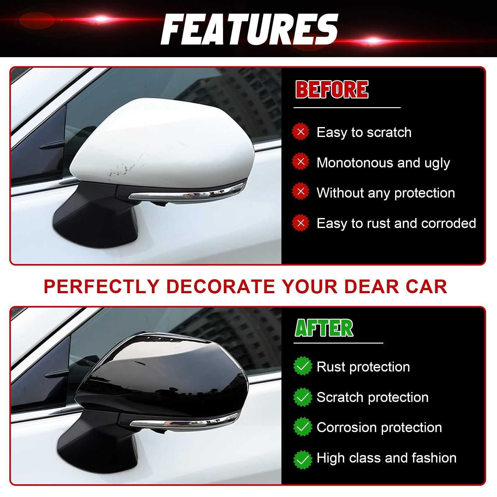 [Seamless Fit] Customized according to the original car size, it can prevent installed area from scratches and won't scrape the paint off or damage the original equipment.