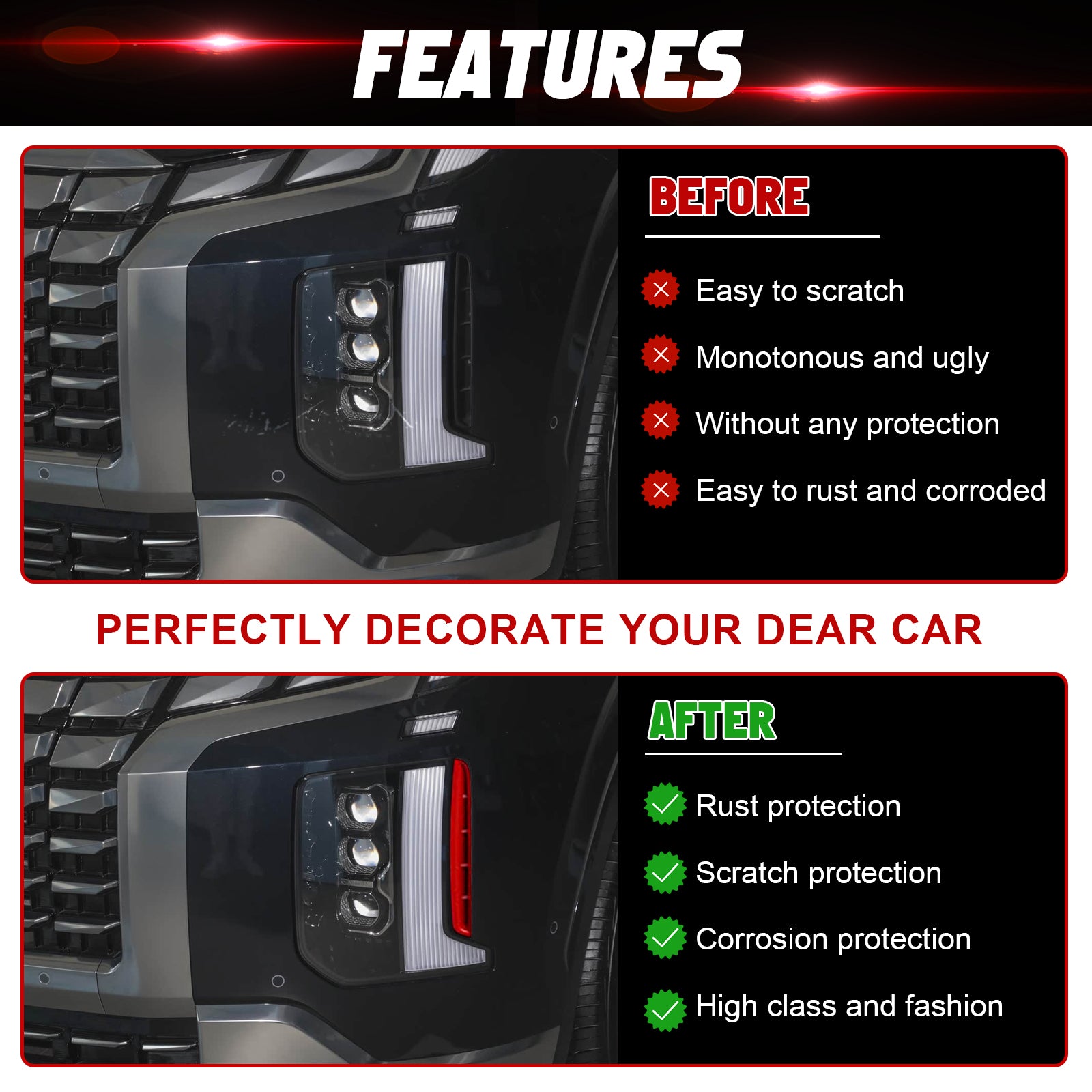 Visual shock and high glossiness which will give your car headlight frame a brand new Unique and Luxury look in minutes!