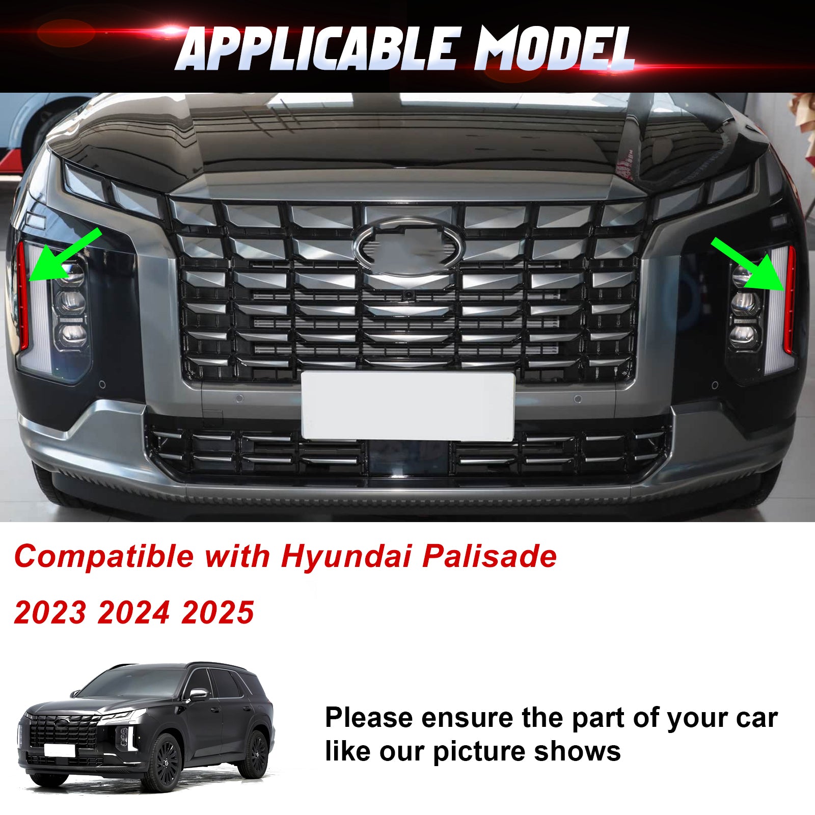 This listing features for 2 pieces of Brand New of ABS Headlight/Fog Light Side Cover Trims, specially design for Hyundai Palisade 2023 2024 2025.