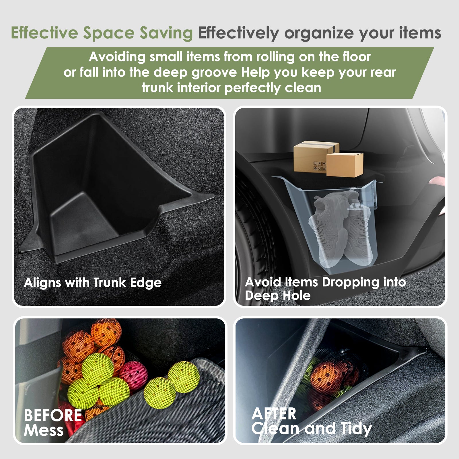 【Effective Space Saving】The storage box can organize your trunk floor debris in an orderly manner, avoiding small items from rolling on the floor or fall into the deep groove, Also can effectively organize your items and prevent dust accumulation, help you keep your rear trunk interior perfectly clean.