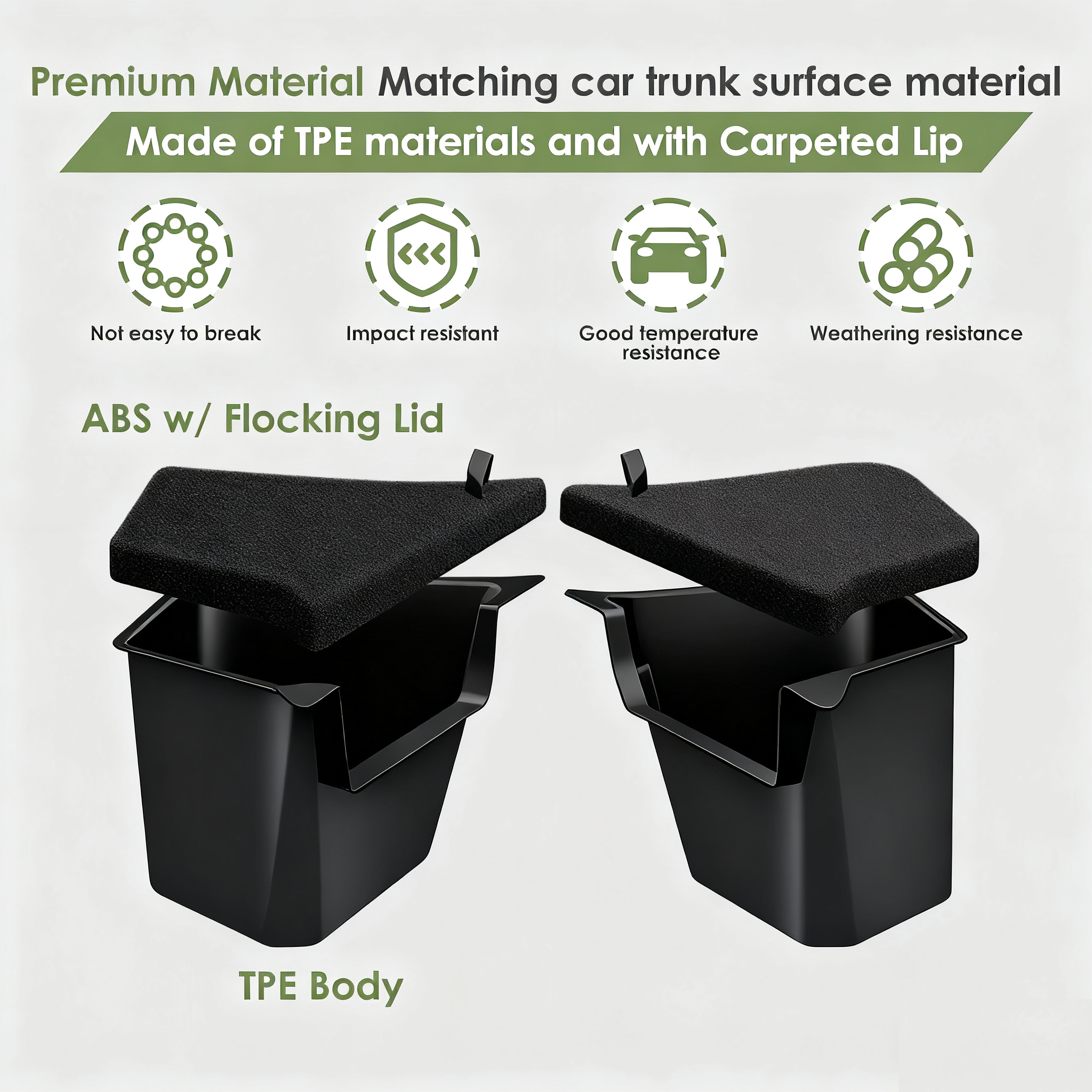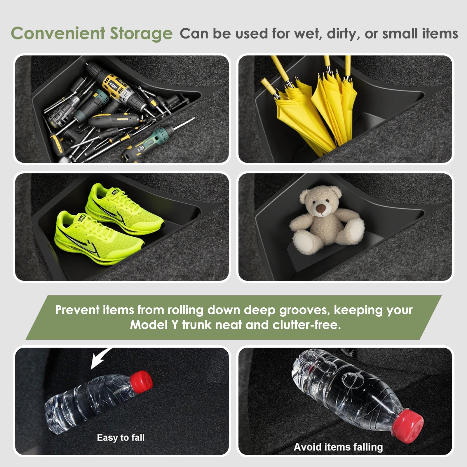 【Convenient Storage】Can be used for wet, dirty, or small items separately like umbrellas, running shoes, toys, wires, or car repairing tools. Matching carpeted lids expand space in the cargo area and prevent items from rolling down deep grooves, keeping your Model Y trunk neat and clutter-free.