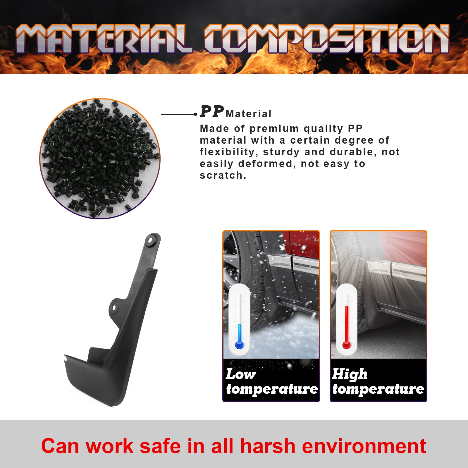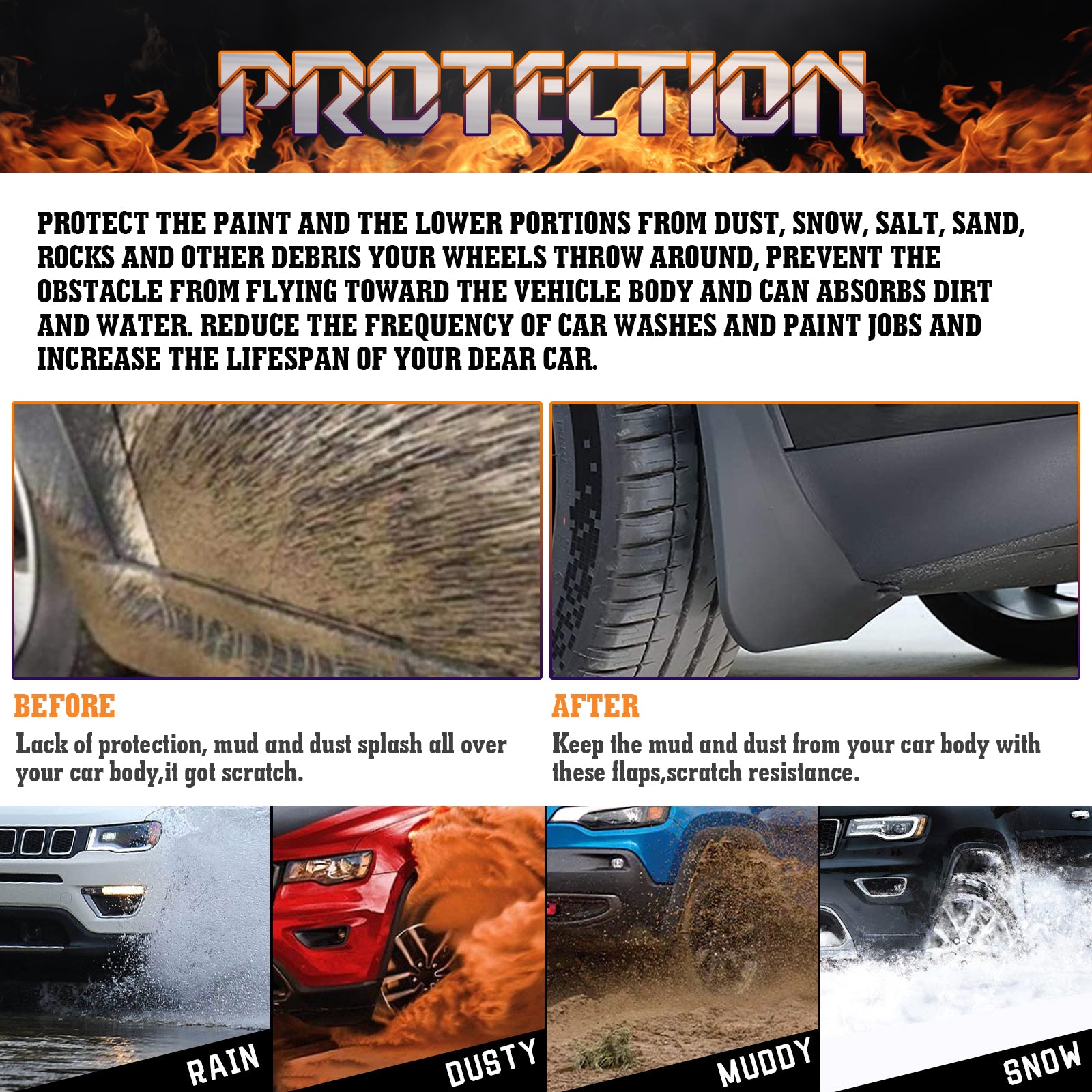 Protection: Protect the paint and the lower portions from dust, snow, salt, sand, rocks and other debris your wheels throw around, prevent the obstacle from flying toward the vehicle body and can absorbs dirt and water. Reduce the frequency of car washes and paint jobs and increase the lifespan of your dear car.