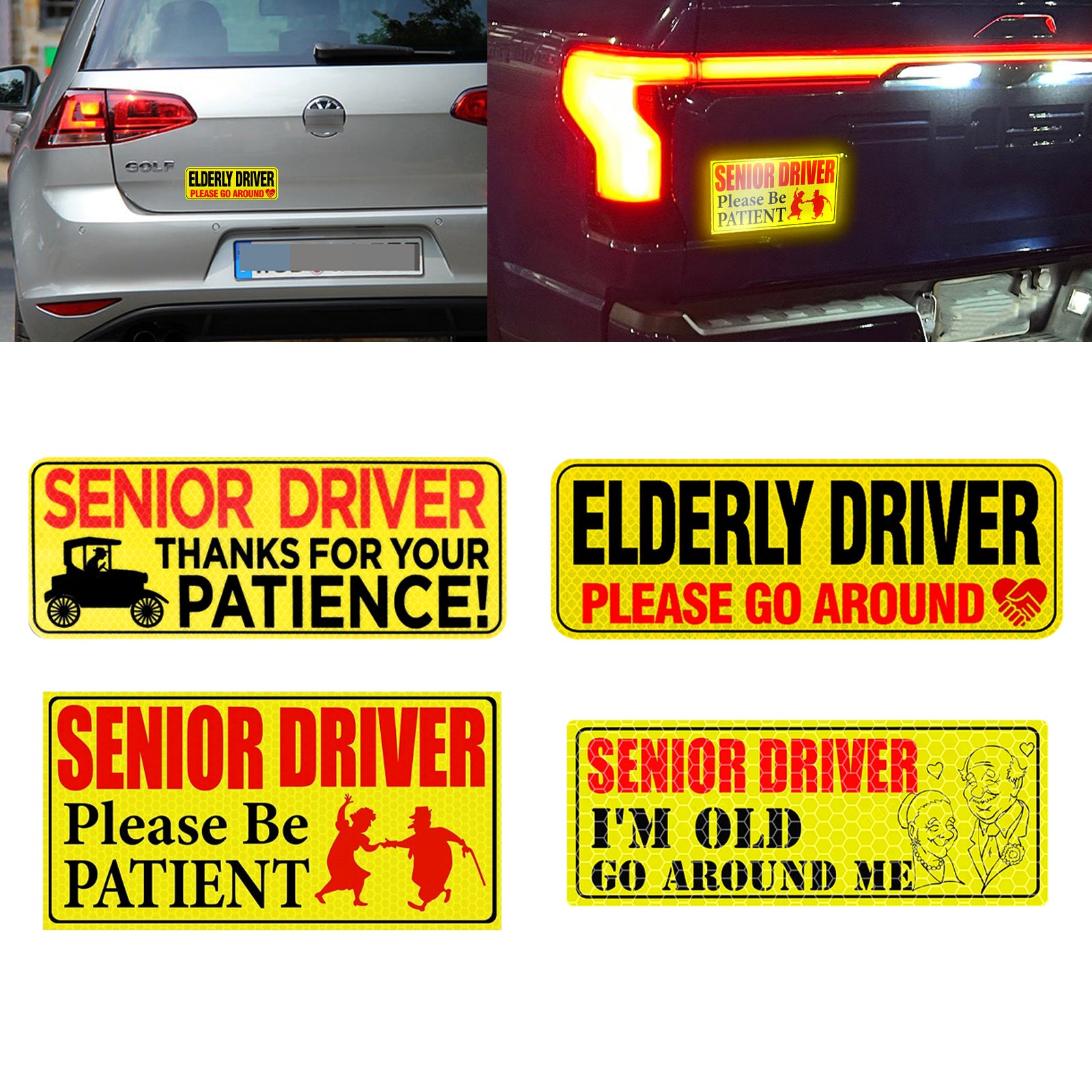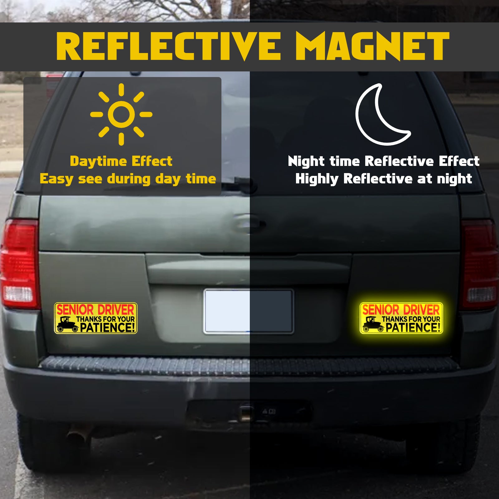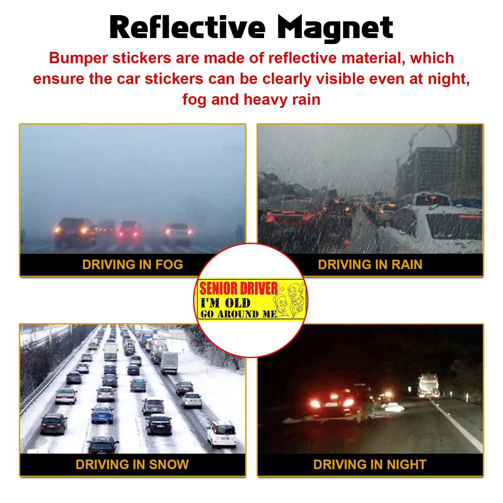 Reflective Magnet: These senior driver bumper stickers are made from high-quality reflective material. This ensures that the stickers remain clearly visible even in low-light conditions, such as at night, in fog, or during heavy rain. This enhanced visibility helps other drivers spot the stickers from the side and rear of the vehicle. Note: the reflective stickers do not emit light on their own and it is reflective under the light