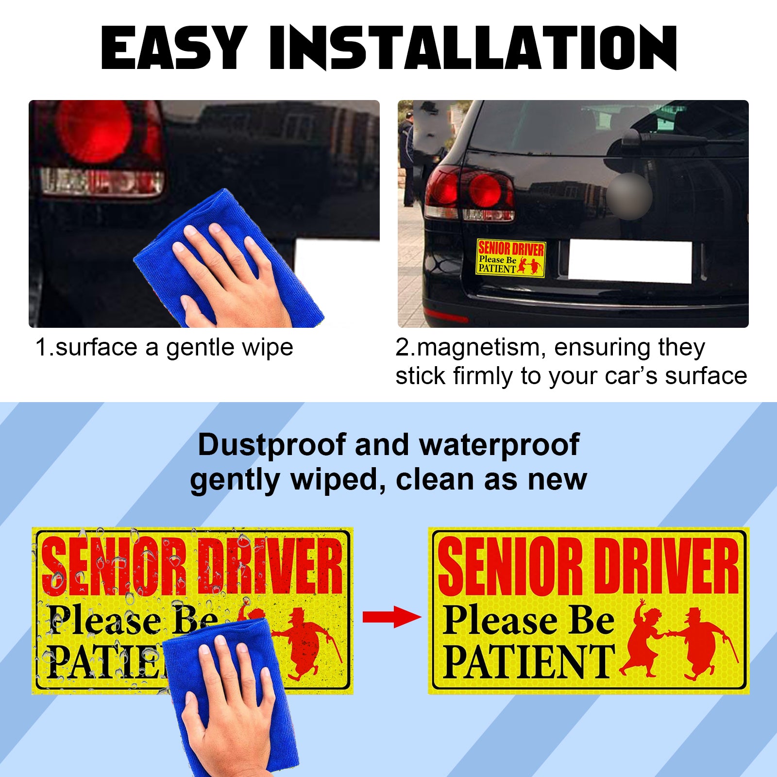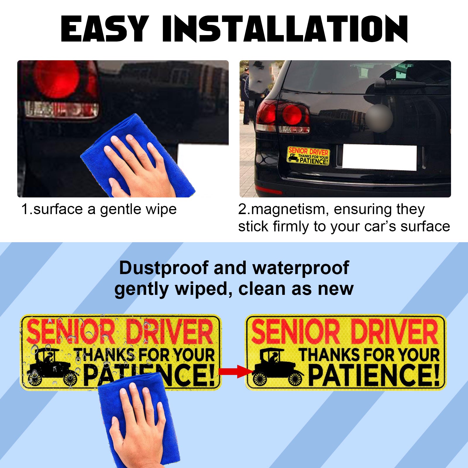 Easy Installation: These senior driver car magnets feature powerful magnetism, ensuring they stick firmly to your car's surface without slipping. They're also easy to remove without leaving any residue. When it comes to cleaning, simply give the surface a gentle wipe, and it'll look as good as new
