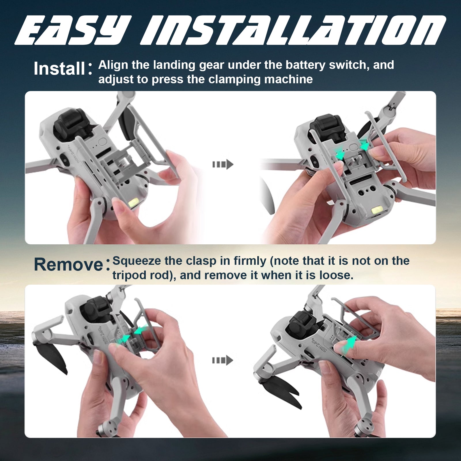 Portable: Easy to install and remove without damaging the drone's chassis. It won't shake or fall off during flight. After installation, the drone's arms can still be opened or folded normally. When the landing gear is folded, the two front propellers can be secured in the gap between the landing gear and the drone