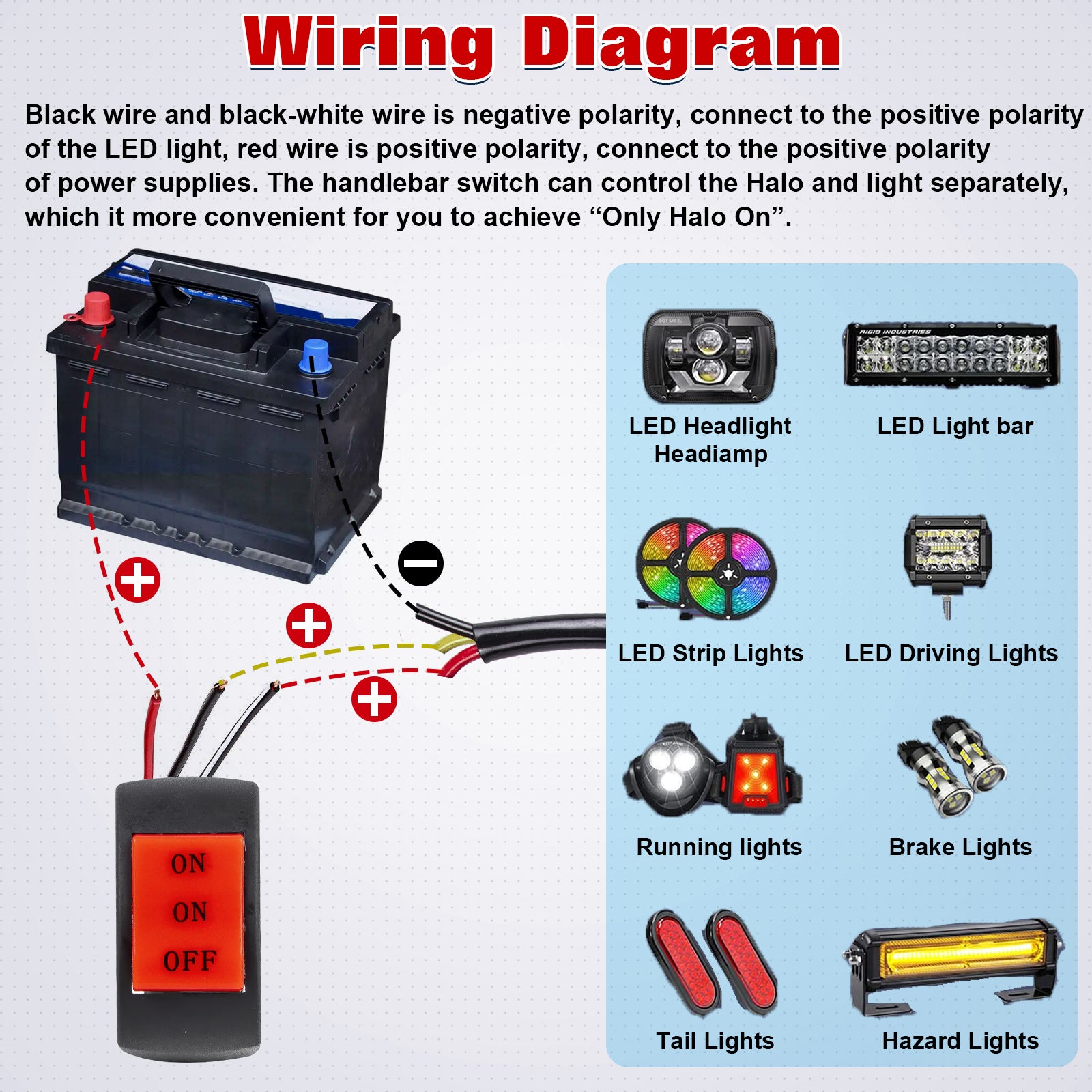 Three-color wiring: It only takes a few minutes to complete the wiring of the motorcycle handlebar switch, black wire and black-white wire is negative polarity, connect to the positive polarity of the LED light, red wire is positive polarity, connect to the positive polarity of power supplies. The handlebar switch can control the Halo and light separately, which it more convenient for you to achieve “Only Halo On”.