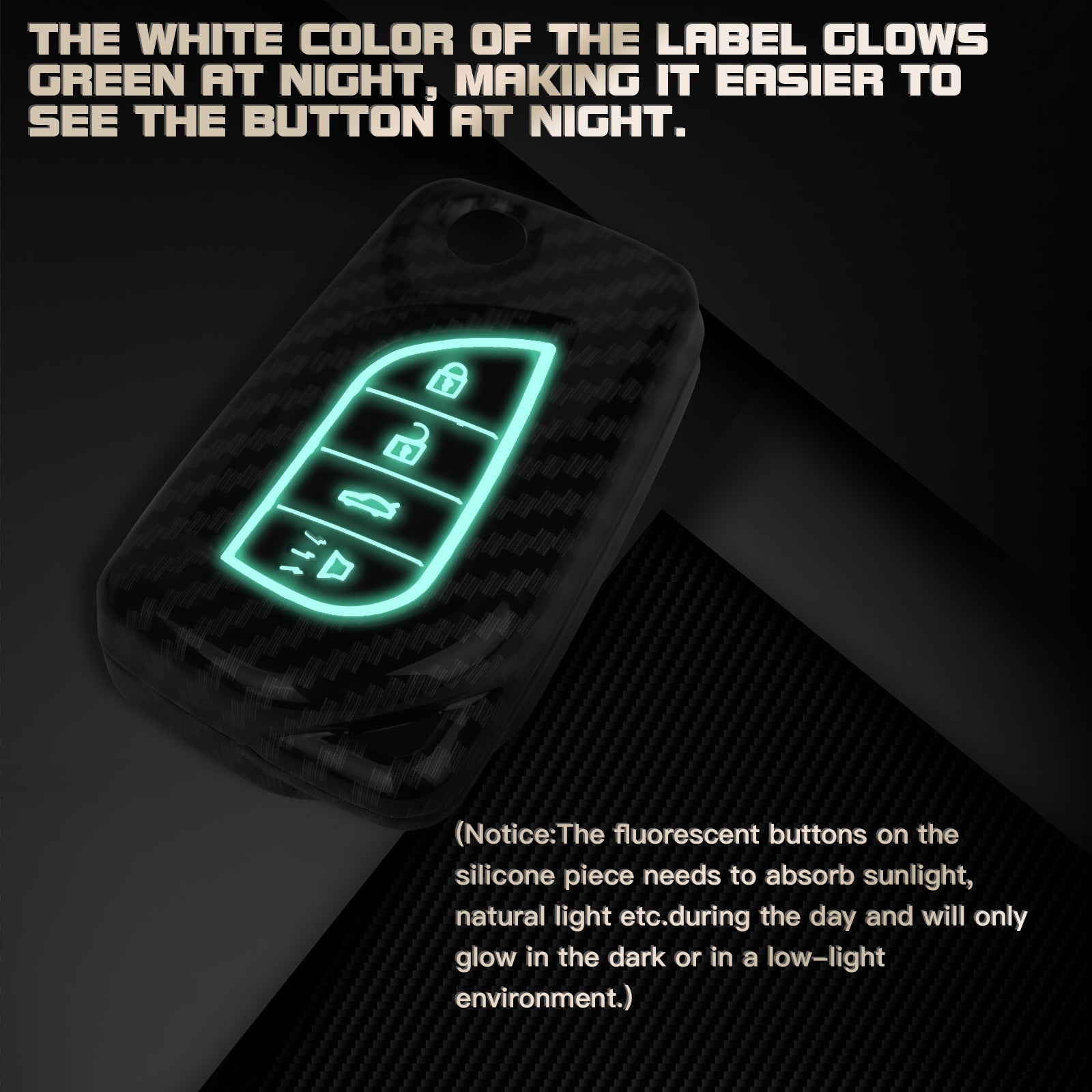 [FEATURES] Unique carbon fiber texture design brings this key fob cover with comfortable excellent touch feeling and stylish. The white color of the label glows green at night, making it easier to see the button at night.(Notice:The fluorescent buttons on the silicone piece needs to absorb sunlight, natural light etc.during the day and will only glow in the dark or in a low-light environment.)