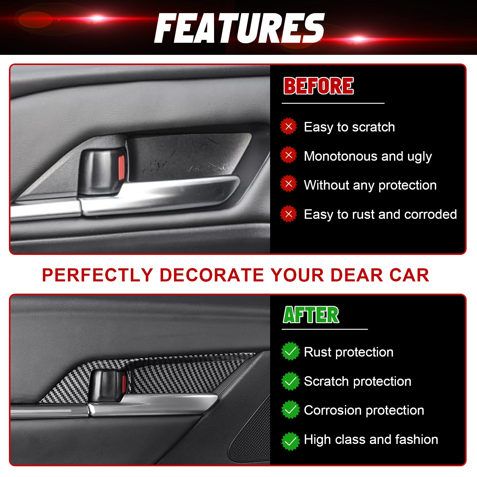 [Seamless Fit] Customized according to the original car size, it can prevent installed area from scratches and won't scrape the paint off or damage the original equipment.